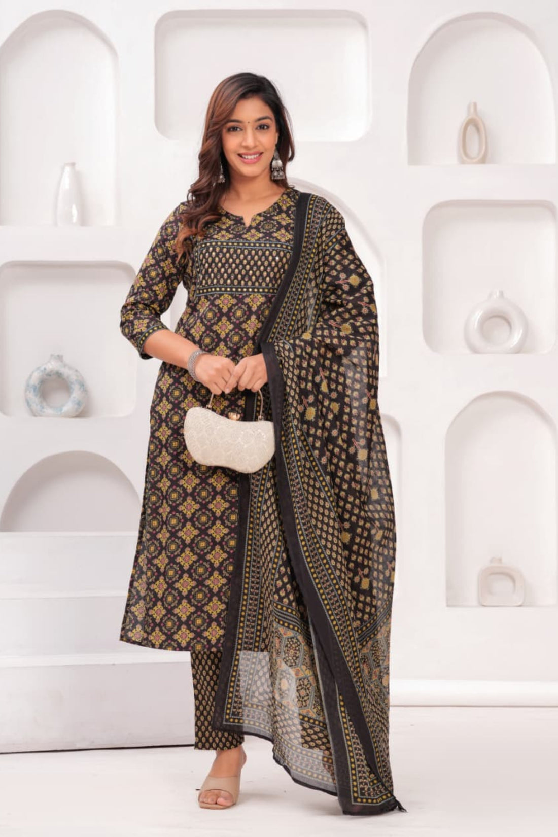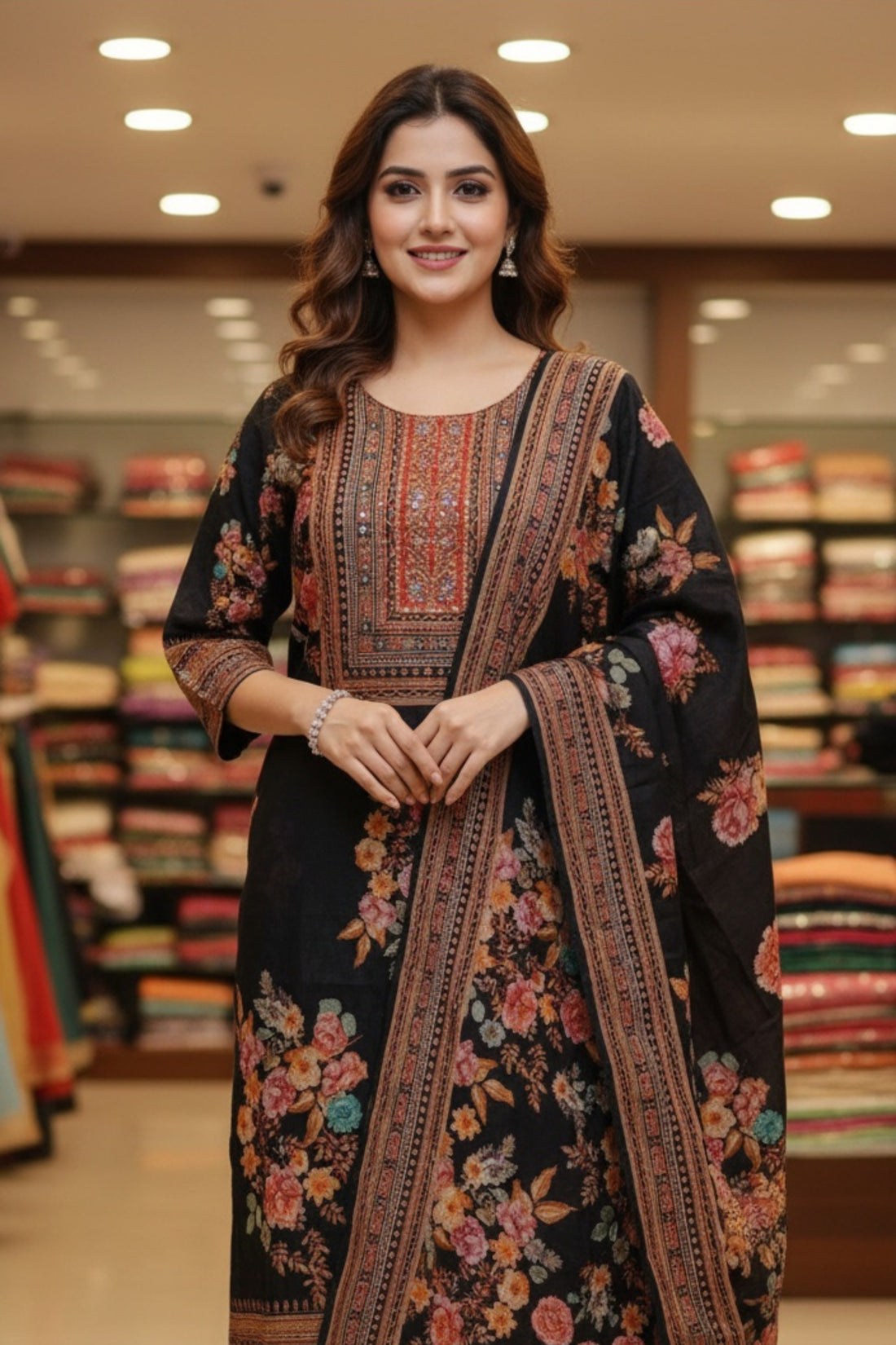Black Floral Printed Ethnic Suit Set with Dupatta