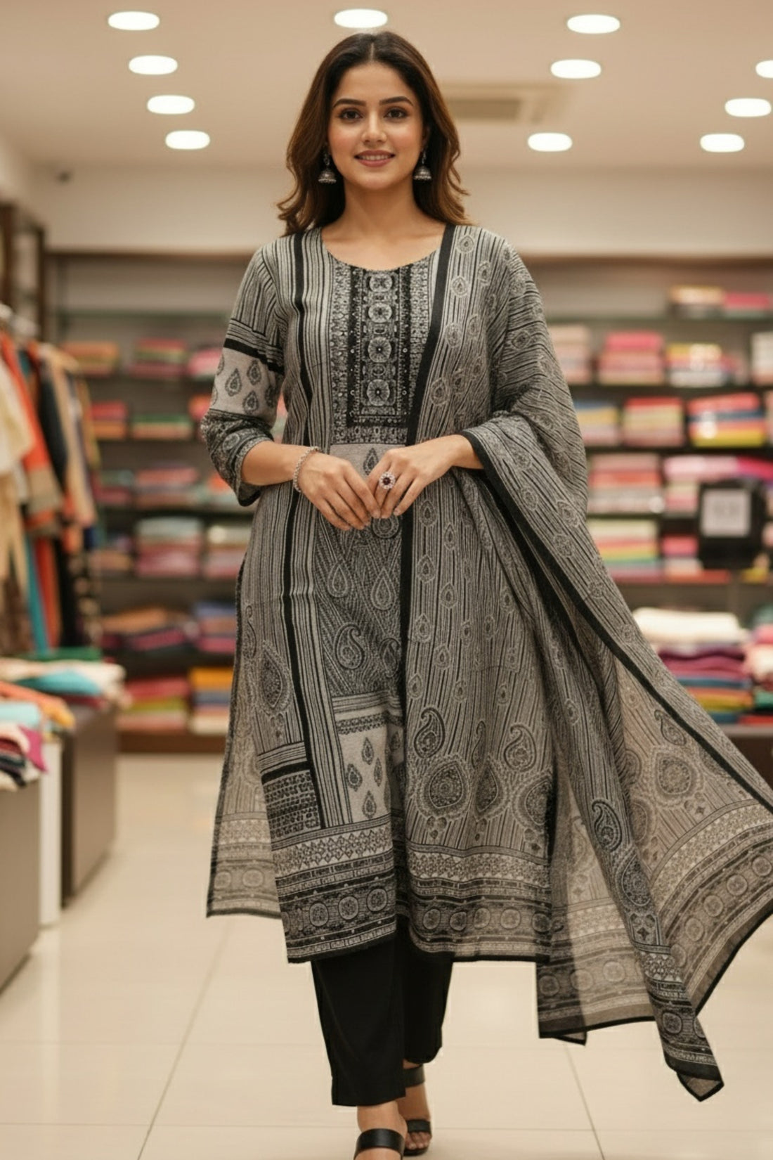 Monochrome Black & Grey Printed Suit Set with Dupatta