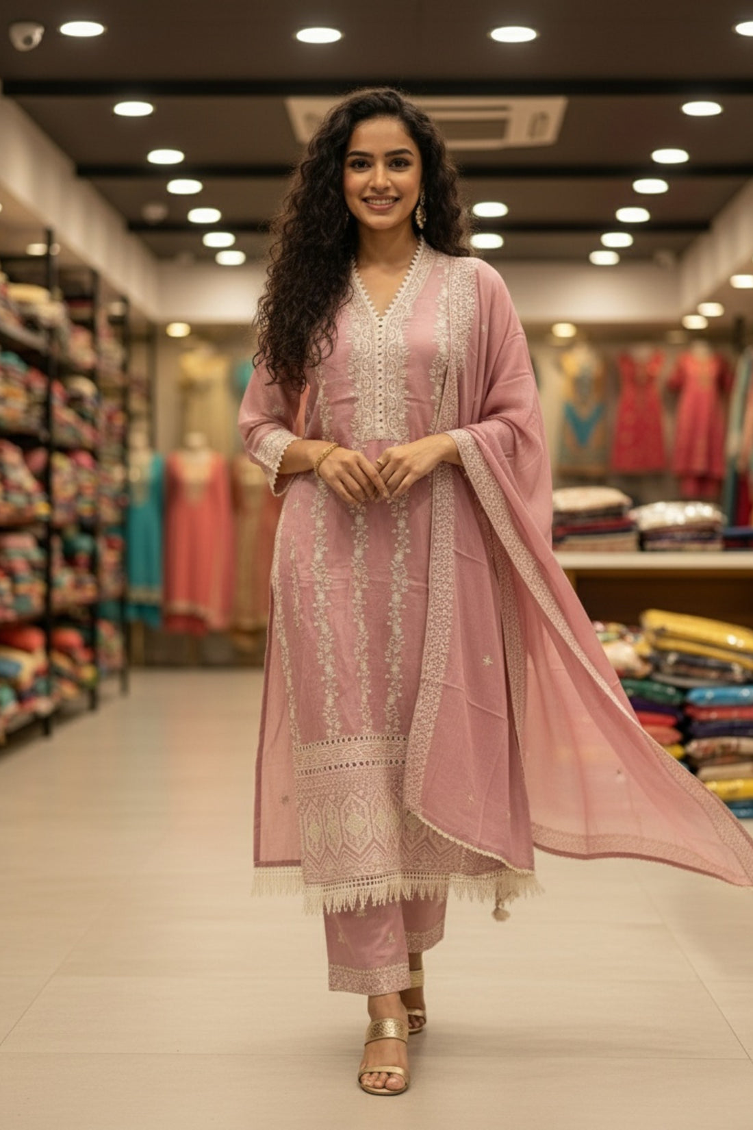 Soft Pink Floral Embroidered Three-Piece Suit Set