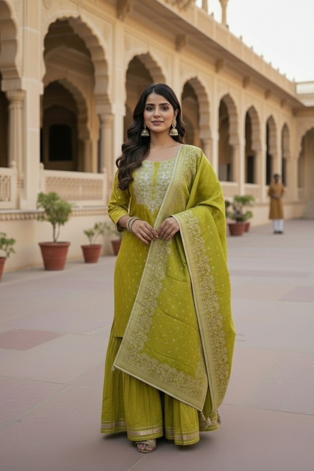 Step into timeless elegance with this Lime Yellow Festive Sharara Suit Set, crafted to perfection...