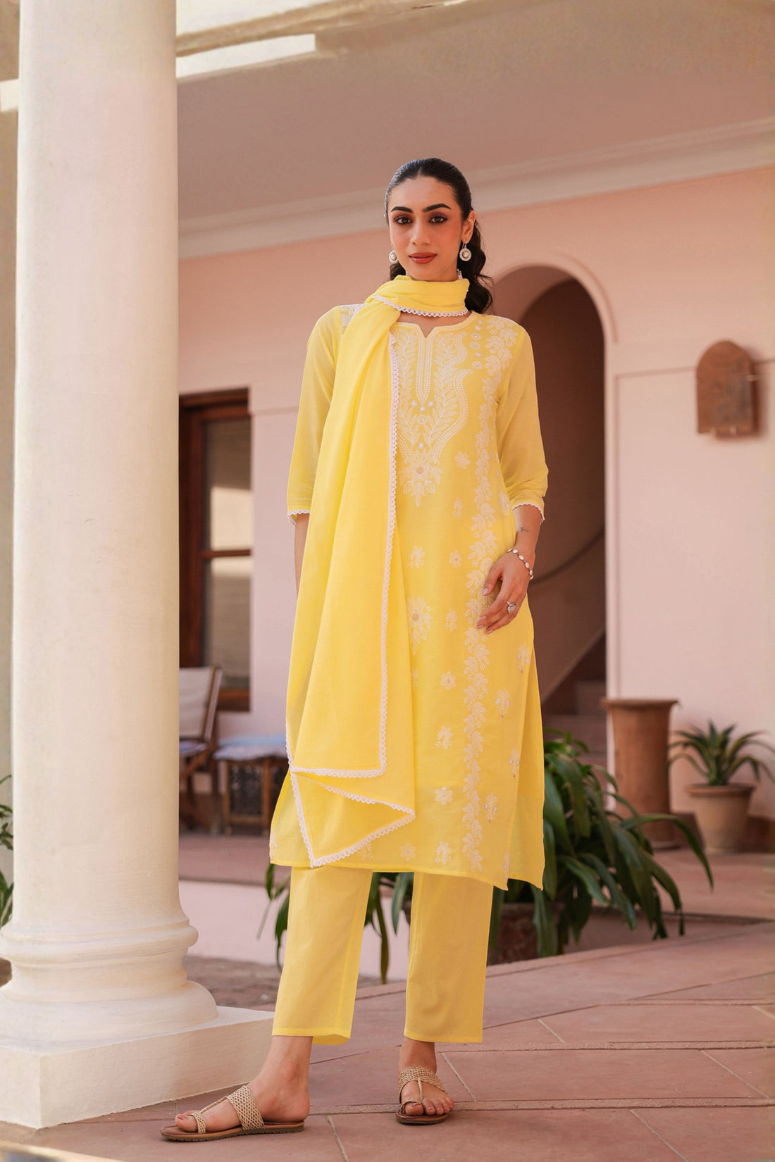 Indulge in the tranquil beauty of our Yellow Bloom Chikankari Suit Set. This graceful three-piece...