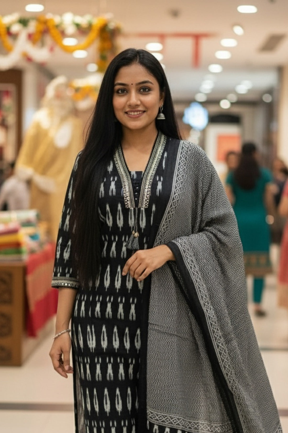 Black Monochrome Ikat Cotton Kurta Pant Set with Matching Dupatta
