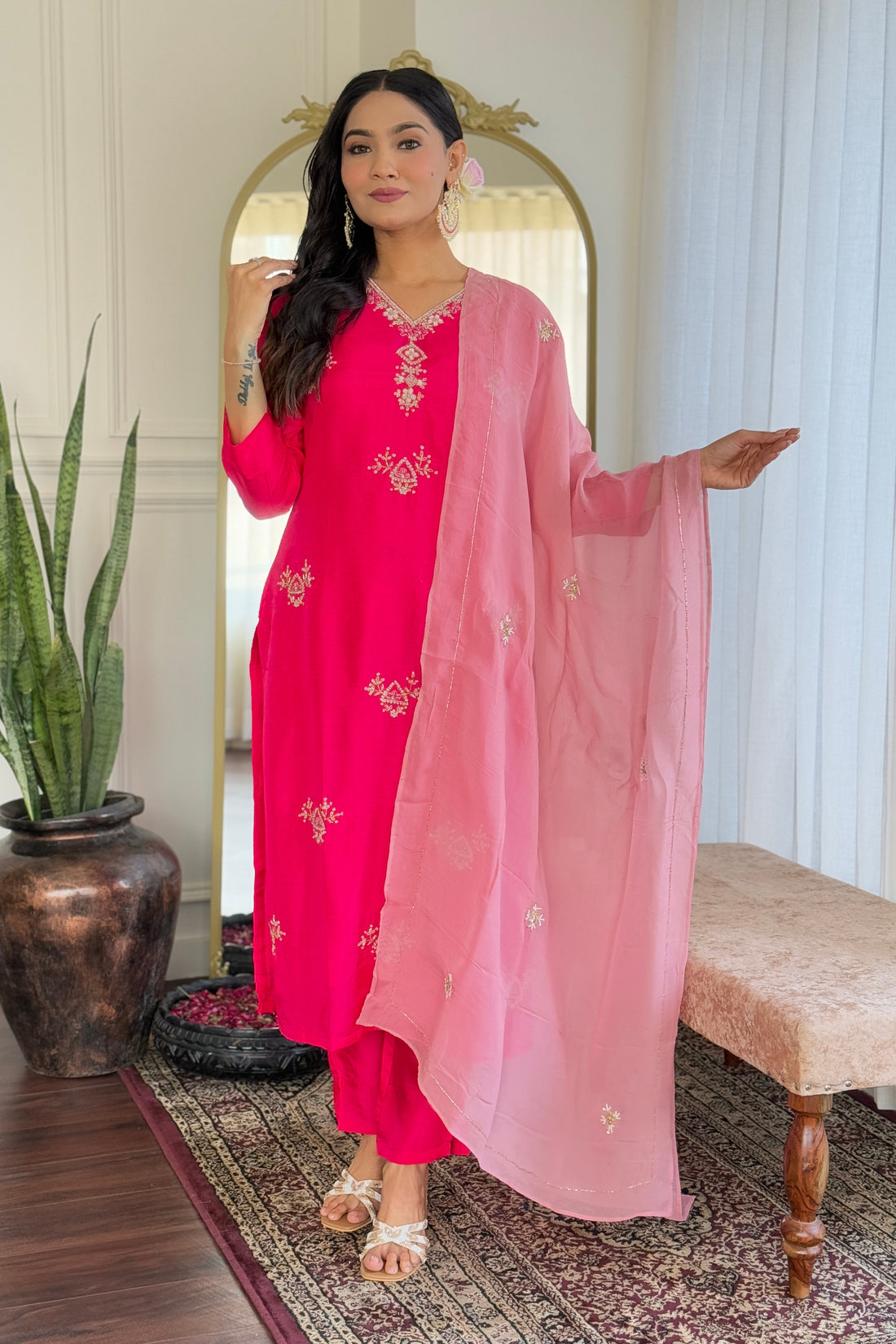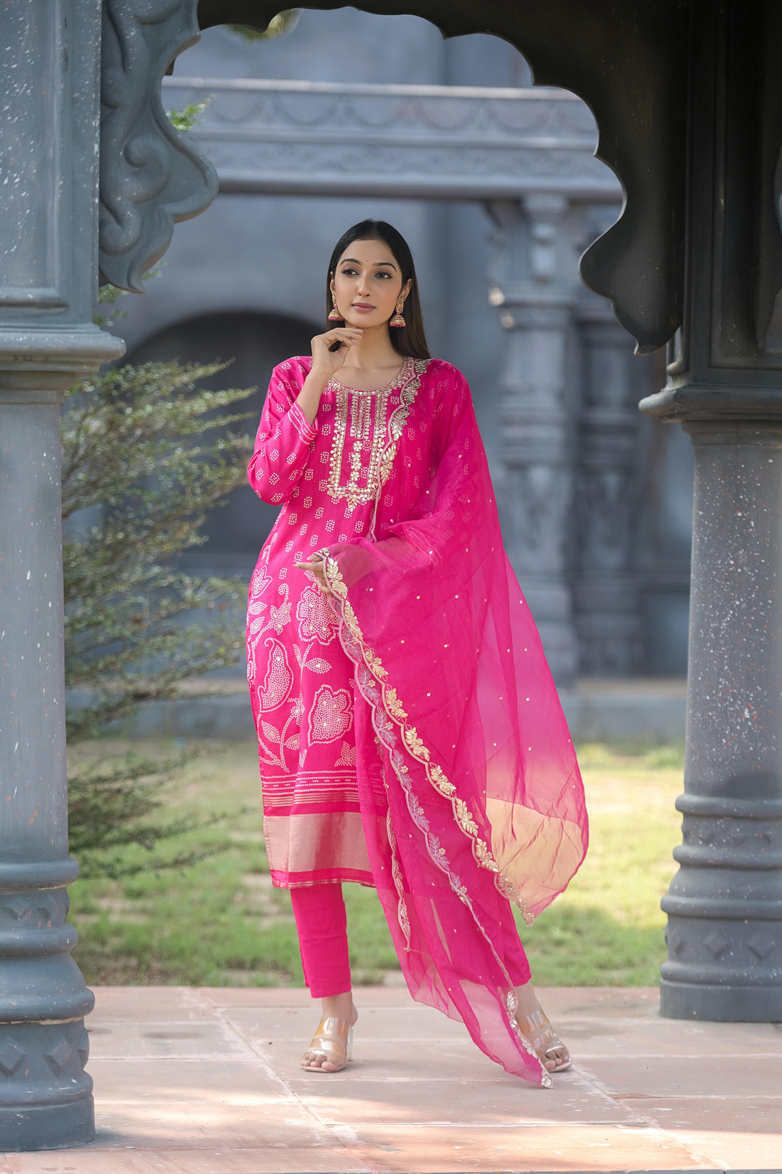 Hot Pink Festive Kurta Set with Intricate Zari Embroidery and Printed Dupatta