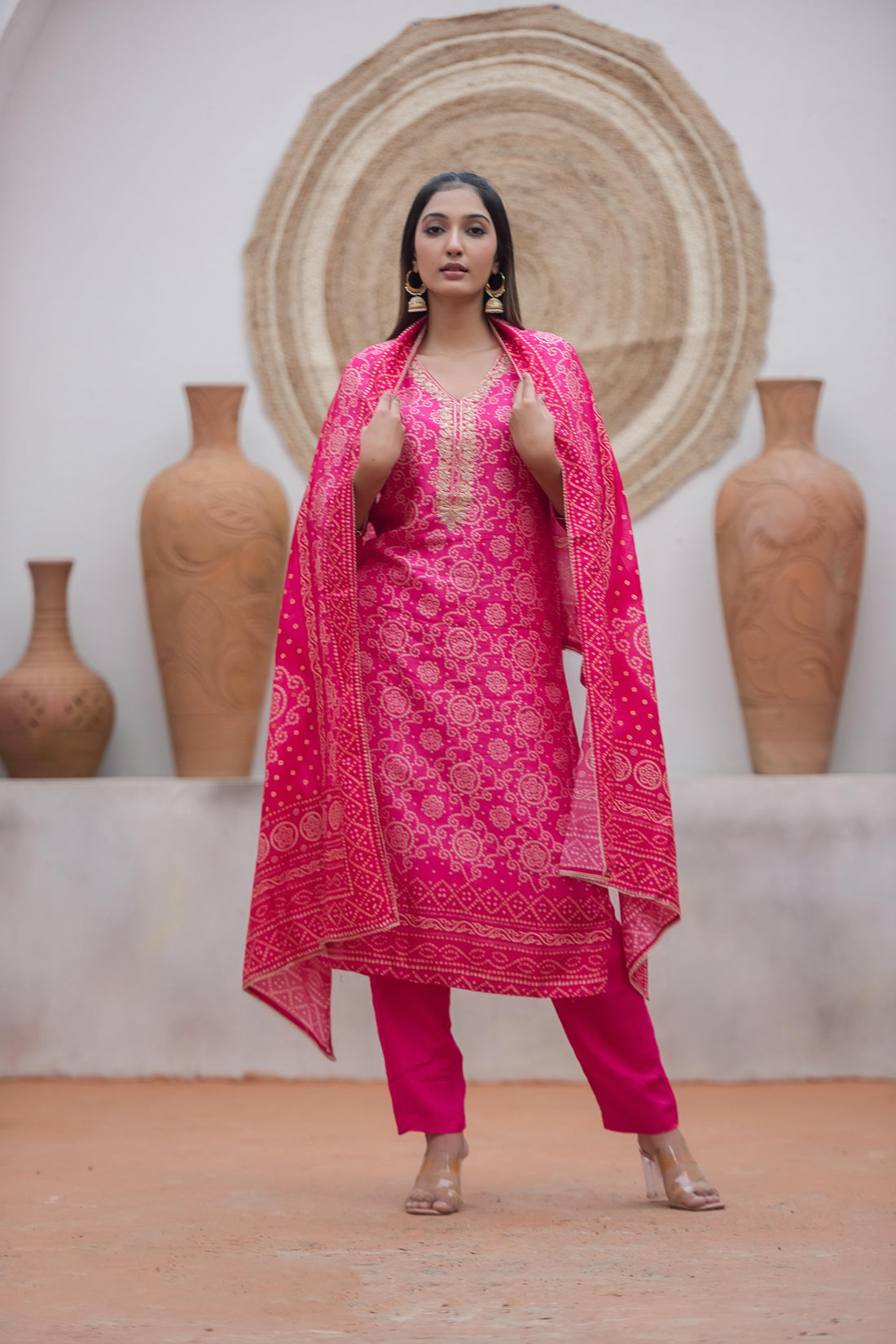 Classic Hot Pink Kurta Set with Gold Detailing & Sheer Dupatta