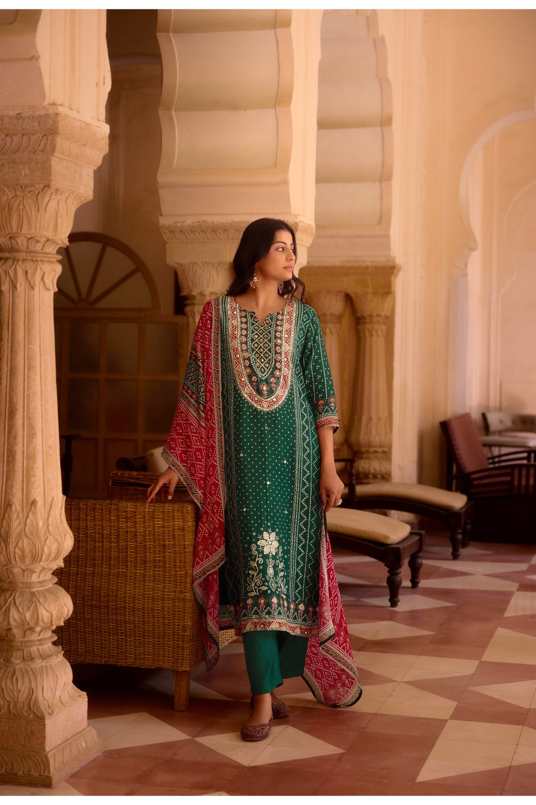 Emerald Green Bandhej Kurta Set with Mirror Work & Ajrakh Print Dupatta