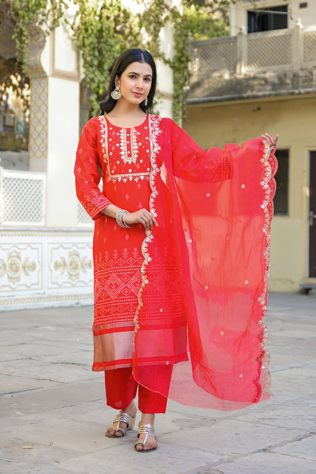 Classic Scarlet Red Ethnic Suit Set with Handcrafted Zari Detailing & Dupatta