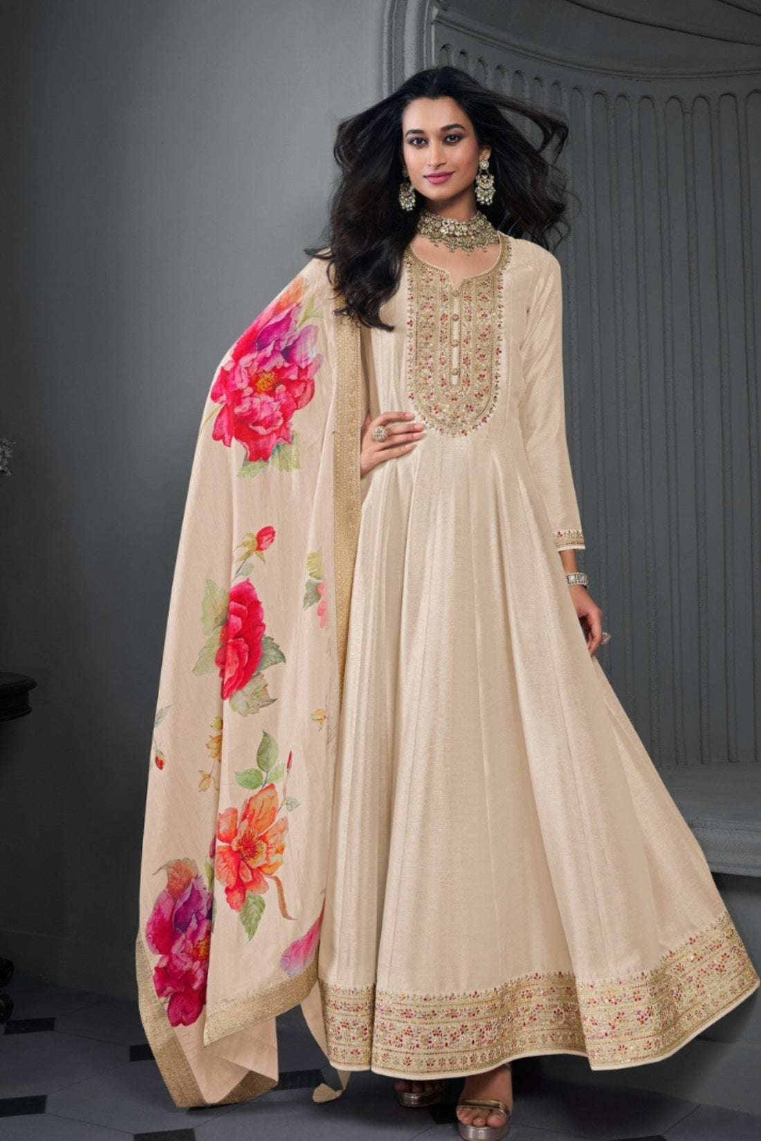Ivory Beige Anarkali Suit Set with Handcrafted Zari Embroidery with Digital Floral Dupatta