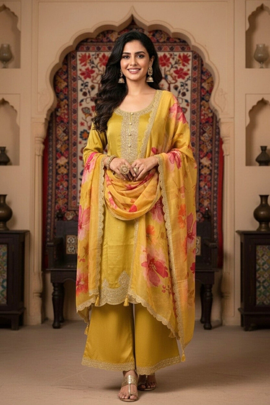 Mustard Yellow Premium 3PC Ethnic Set with Embroidered Kurta & Floral Dupatta