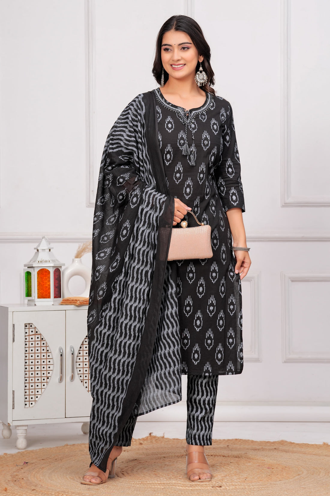 Classic Black & Grey Ikat Cotton Kurta Pant Dupatta Set