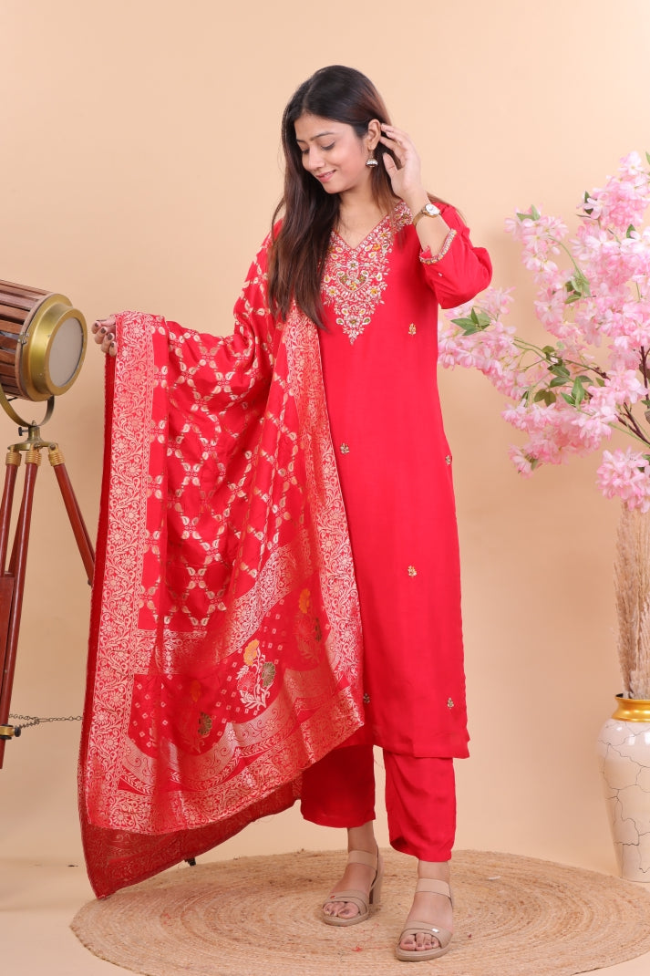 Luxury Red Silk Suit with Zari Embroidery and Dupatta