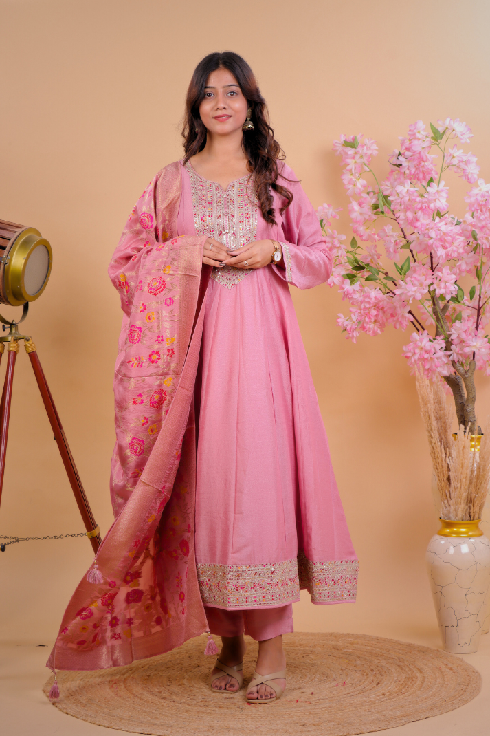 Blush Pink Silk Anarkali Suit with Intricate Zari Embroidery & Floral Dupatta