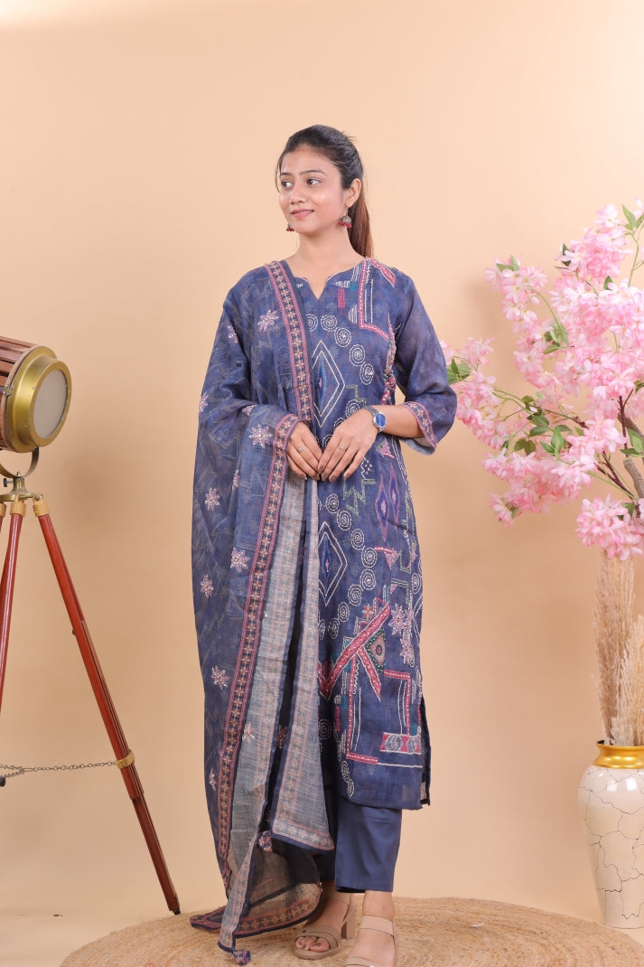 Step into timeless elegance with this Navy Blue Cotton Embroidered Suit Set, designed to blend...