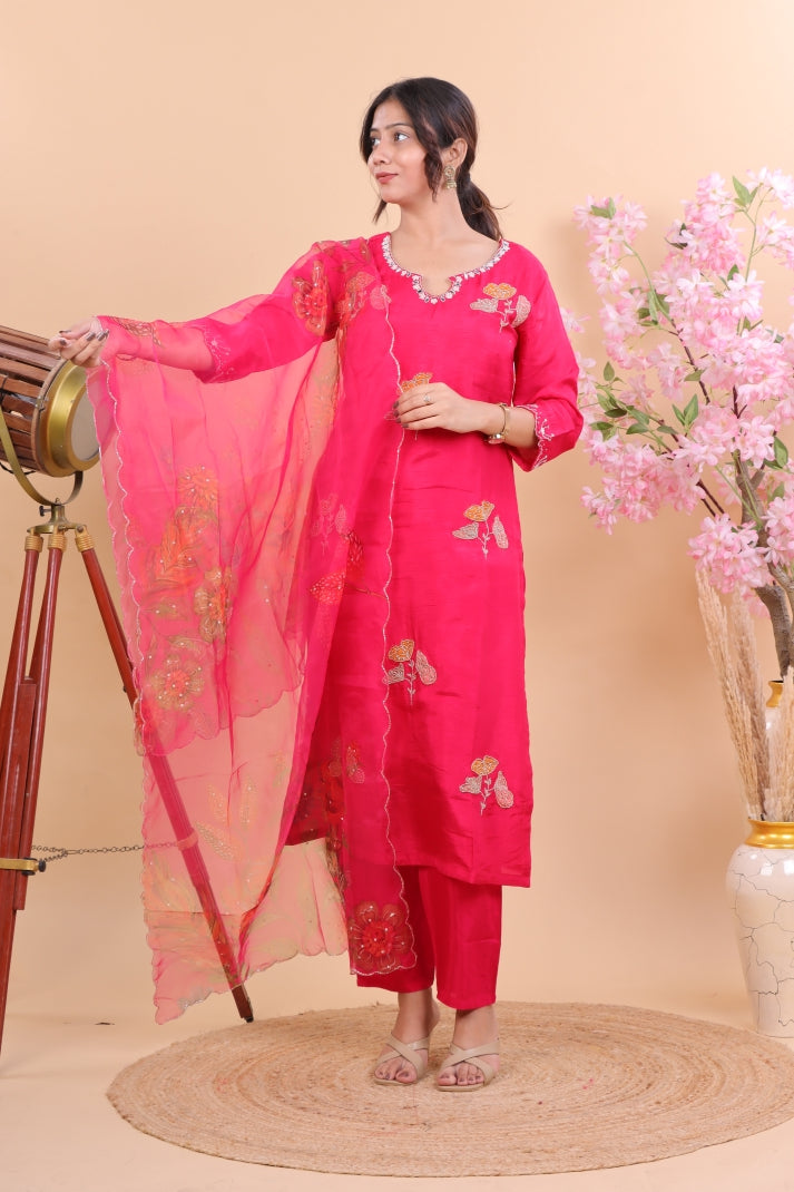 Graceful Pink Silk Suit with Hand Embroidered Floral Detailing & Dupatta