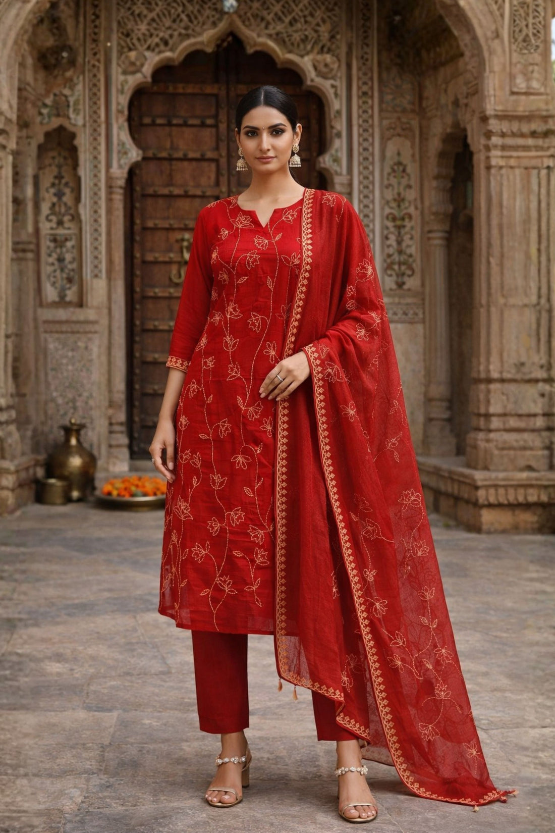 Orange Embroidered Chanderi 3-Piece Suit Set