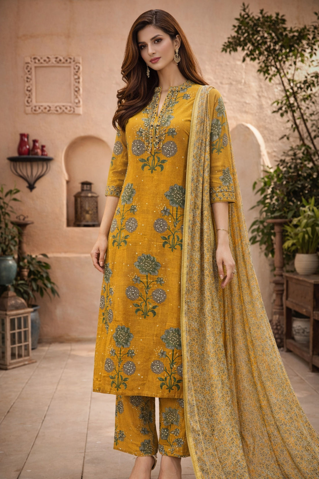 Mustard Bloom Floral Embroidered Suit Set