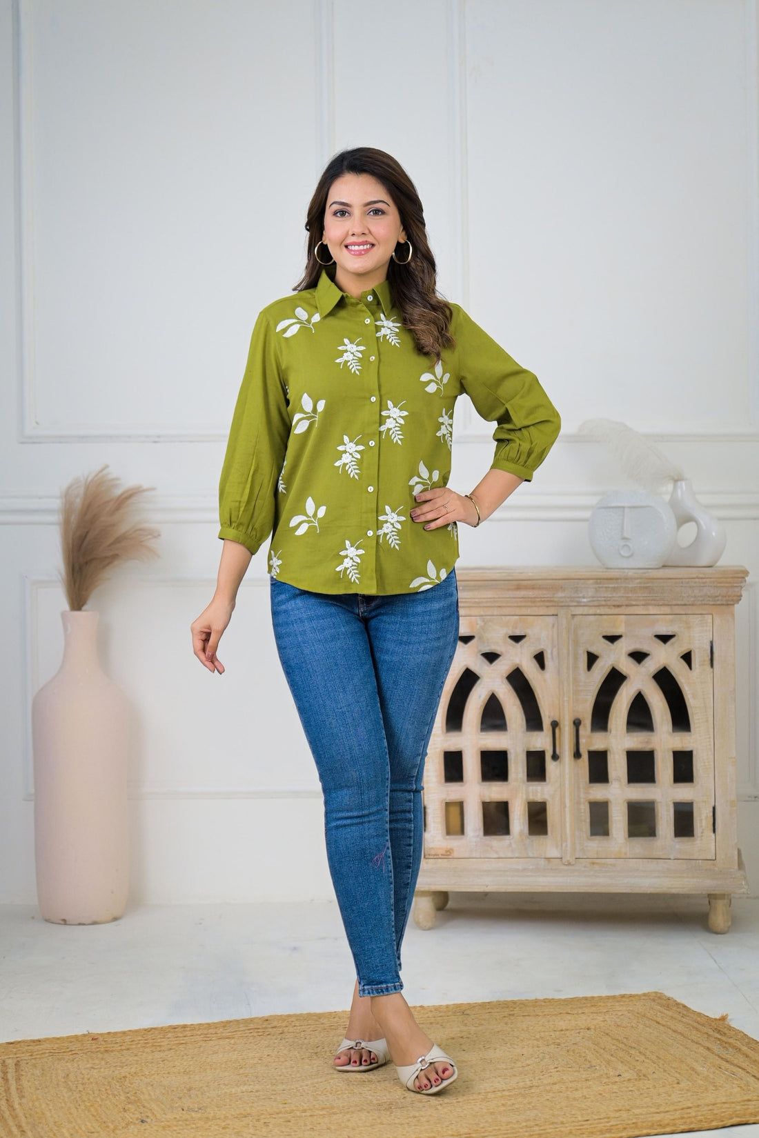 Refresh your casual wardrobe with this green button-down shirt featuring elegant white floral Embroidery. Designed...