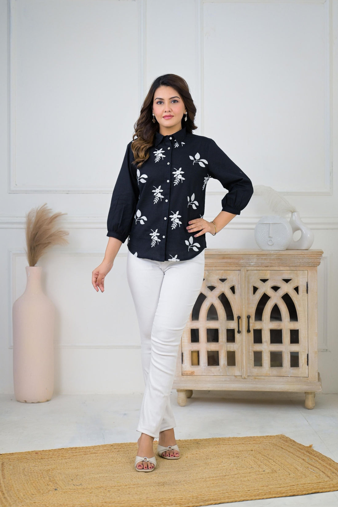 Upgrade your everyday wardrobe with this black button-down shirt featuring elegant white Embroidery prints. Designed...