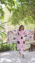 Make a bold style statement with our Graphic Bloom Printed Anarkali Suit Set. This striking three-piece ensemble features a white Anarkali kurta with a modern abstract print incorporating red geometric lines and bold black floral motifs. The set includes comfortable white pants and a coordinating printed dupatta with a unique geometric and floral border. The detailed neckline with subtle embellishments adds a touch of contemporary flair to this eye-catching outfit.