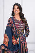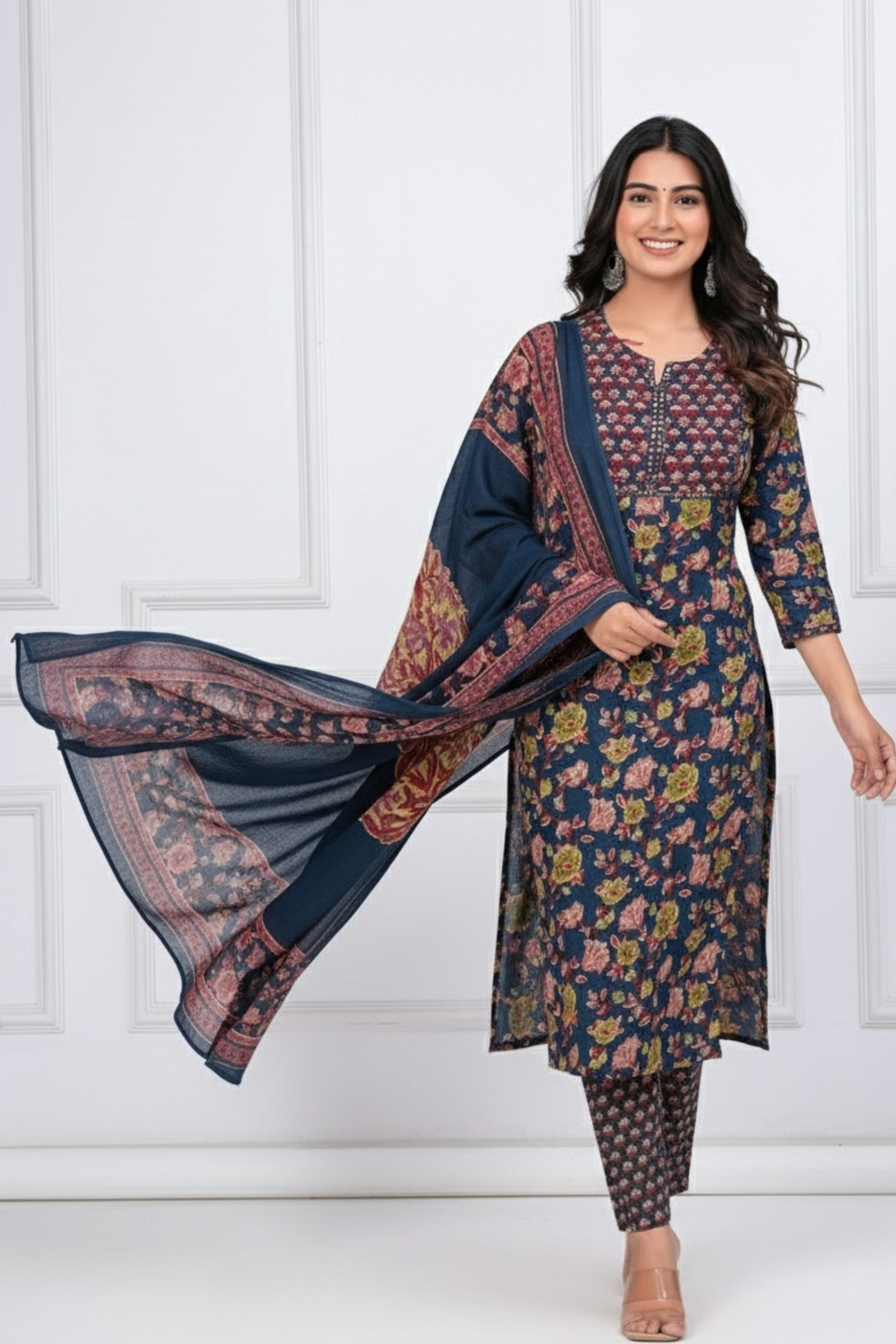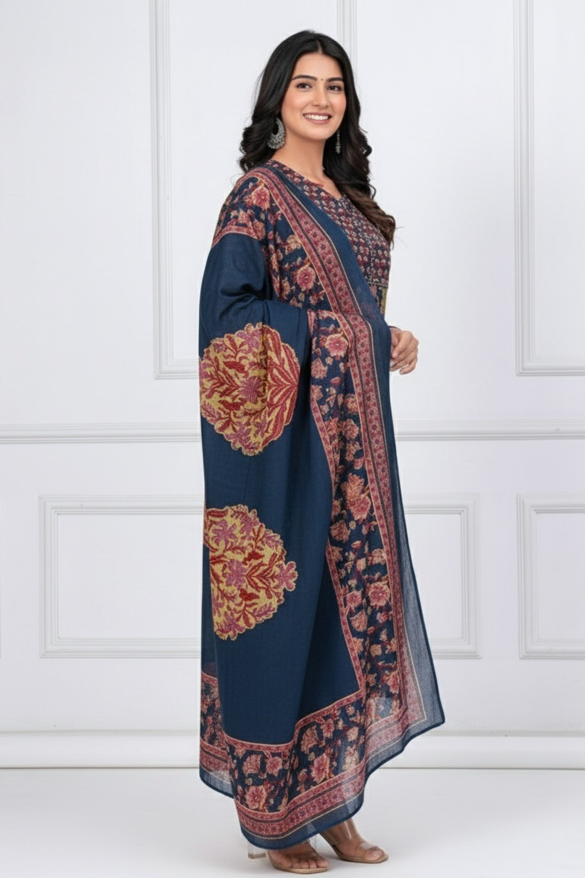 Artisanal Blue with multi color Floral Kurta Pant Set with printed Dupatta