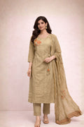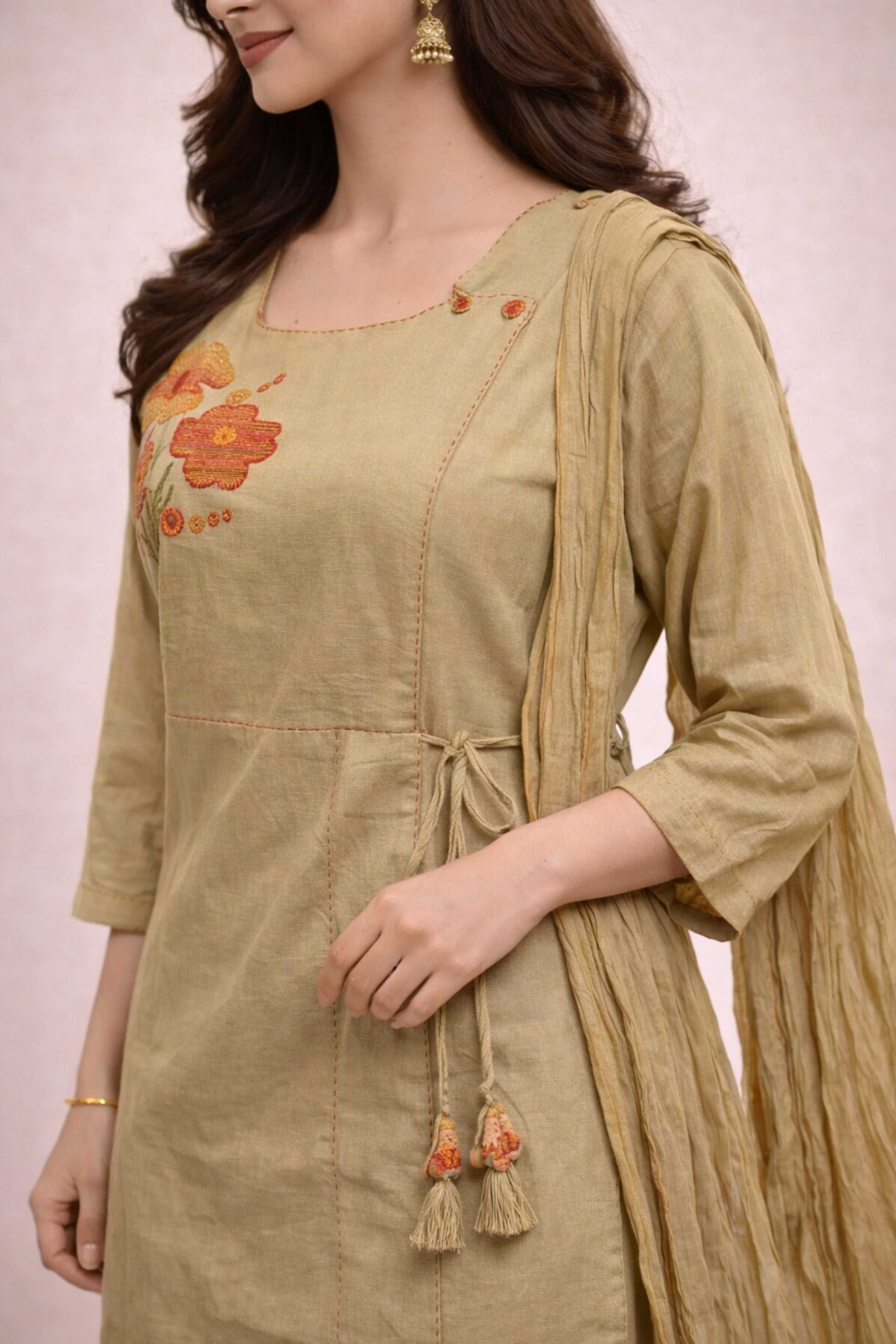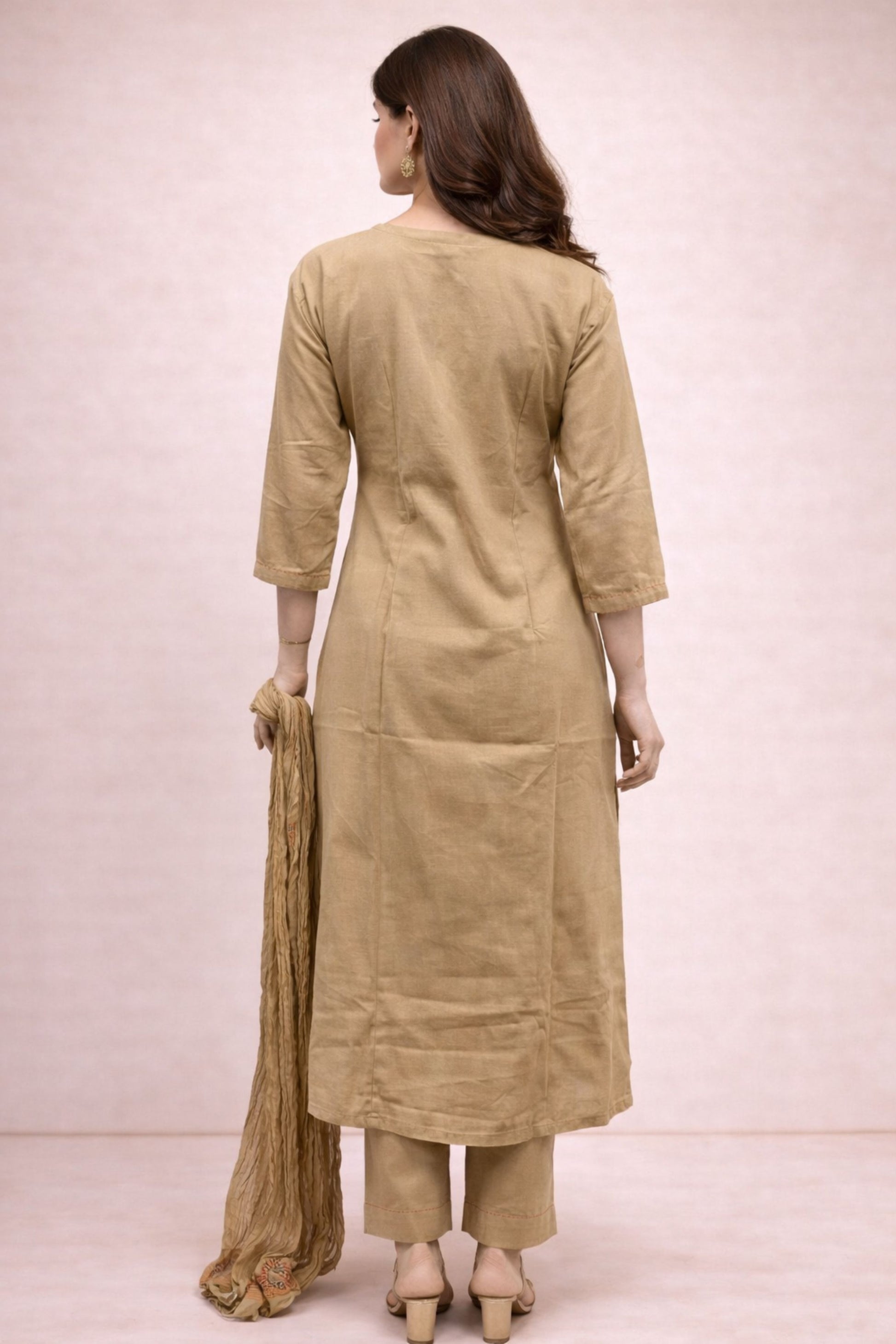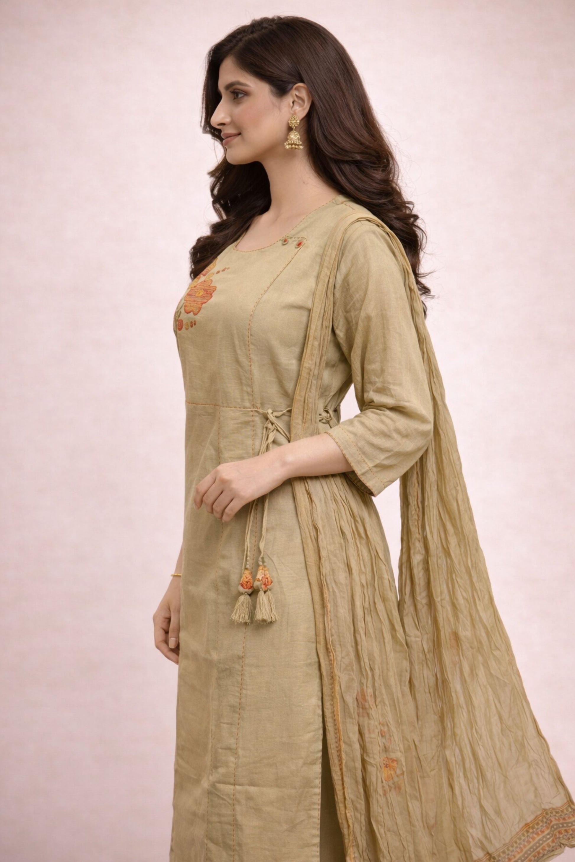 This beige cotton flex 3-piece suit set features a straight-cut Angrakha kurta paired with matching pants and a coordinated dupatta. The soft beige tone complemented by subtle floral detailing creates a calm and elegant ethnic look, perfect for everyday wear and light festive occasions. Crafted from comfortable and breathable cotton flex fabric, this set offers a relaxed fit with effortless drape. Simple, graceful, and versatile, it is an ideal choice for timeless ethnic dressing.