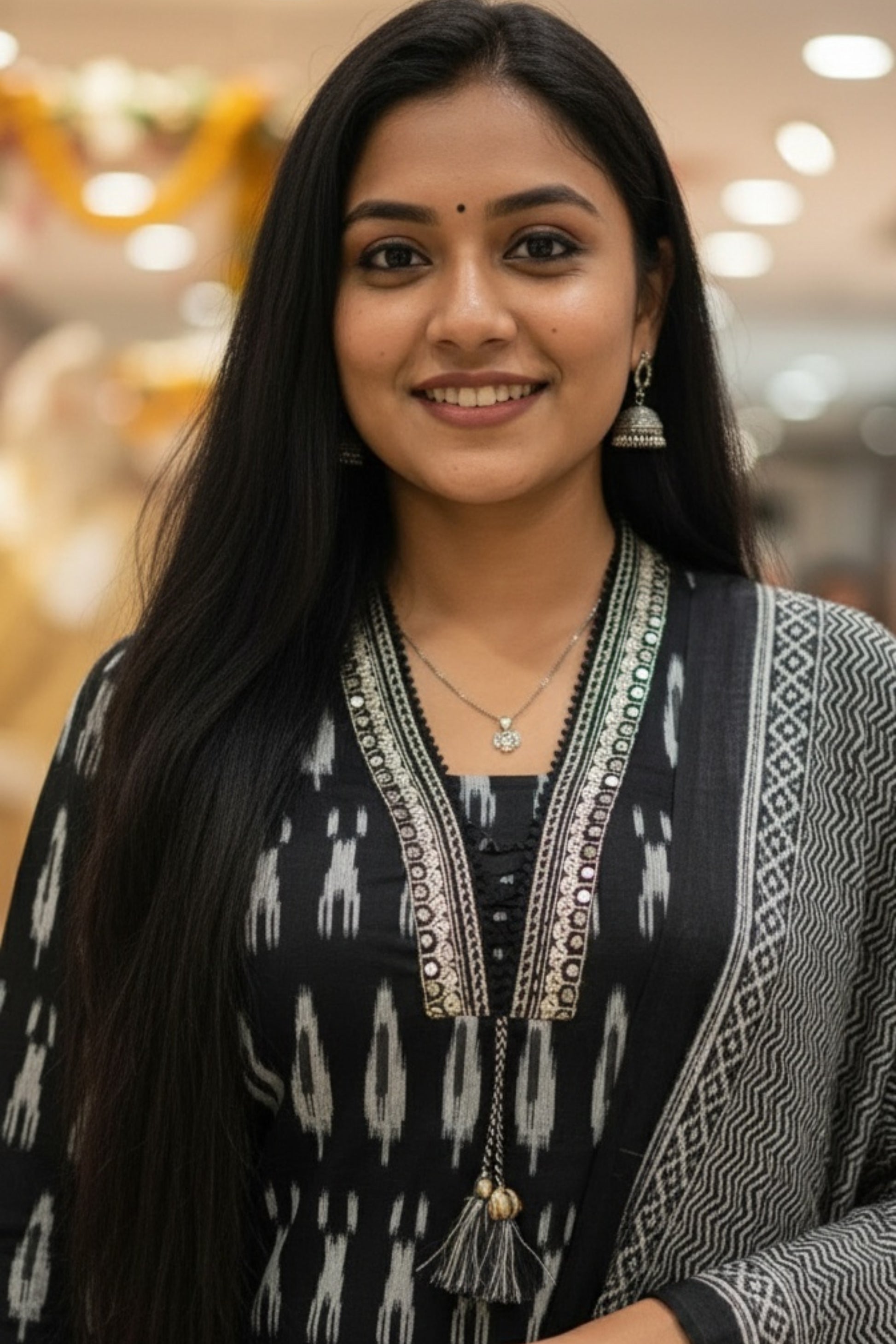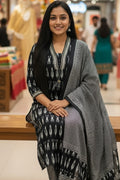Bring effortless charm to your wardrobe with this Black Monochrome Ikat Cotton Kurta Pant Set. Designed in breathable cotton, the kurta features classic black and grey ikat patterns paired with straight-fit pants and a matching dupatta. Perfect for both everyday wear and festive gatherings, this timeless set blends comfort with elegance, keeping you stylish all day long.