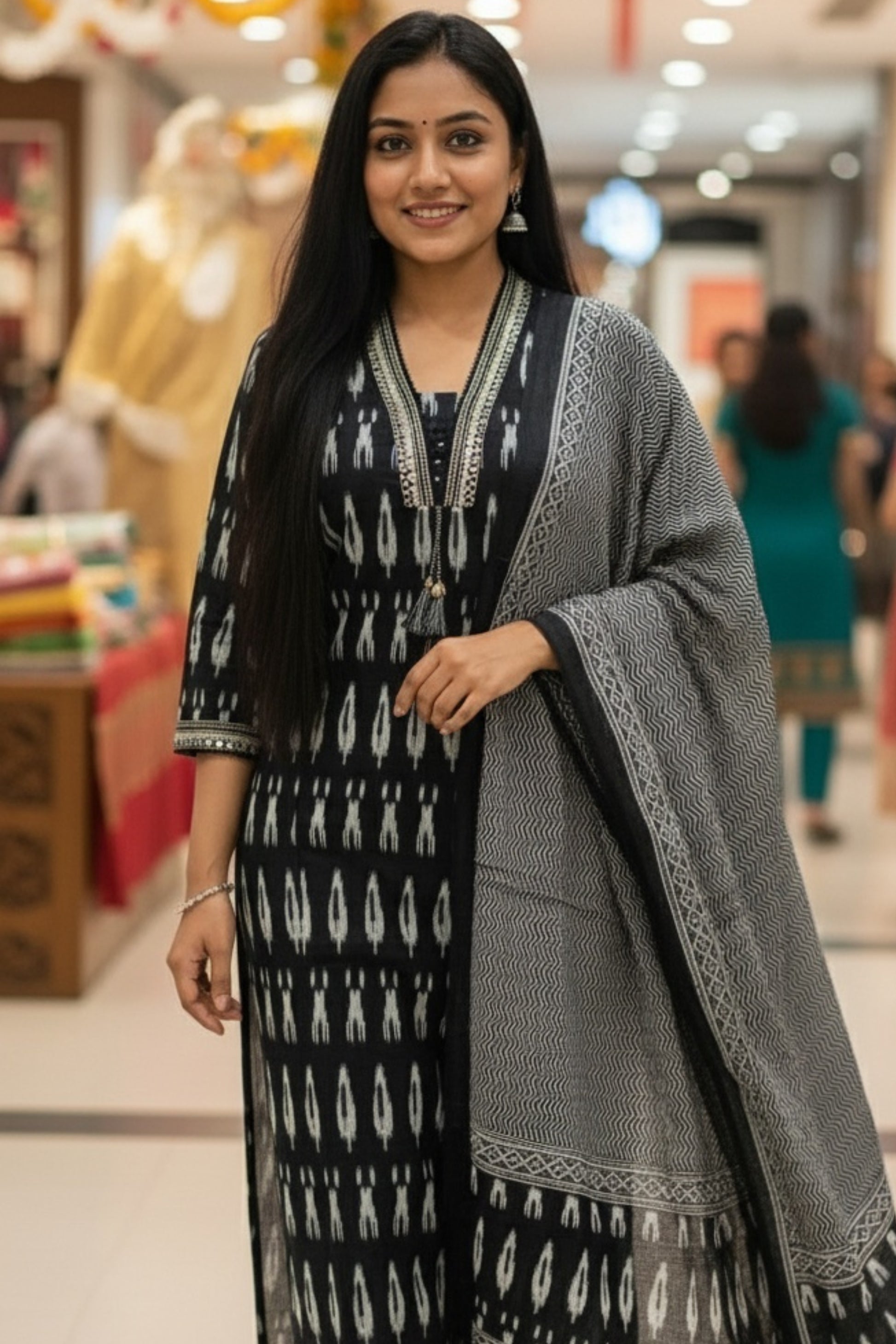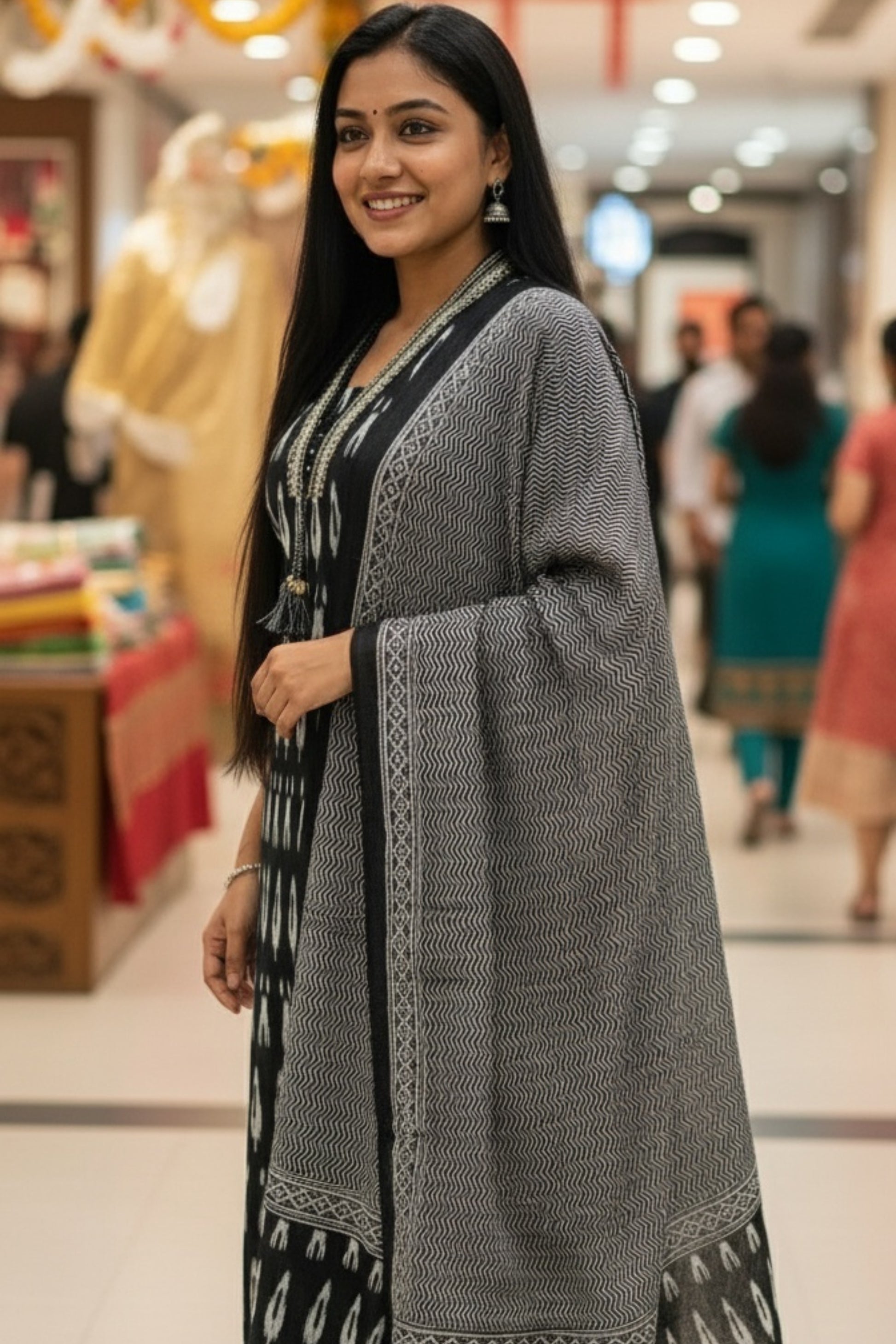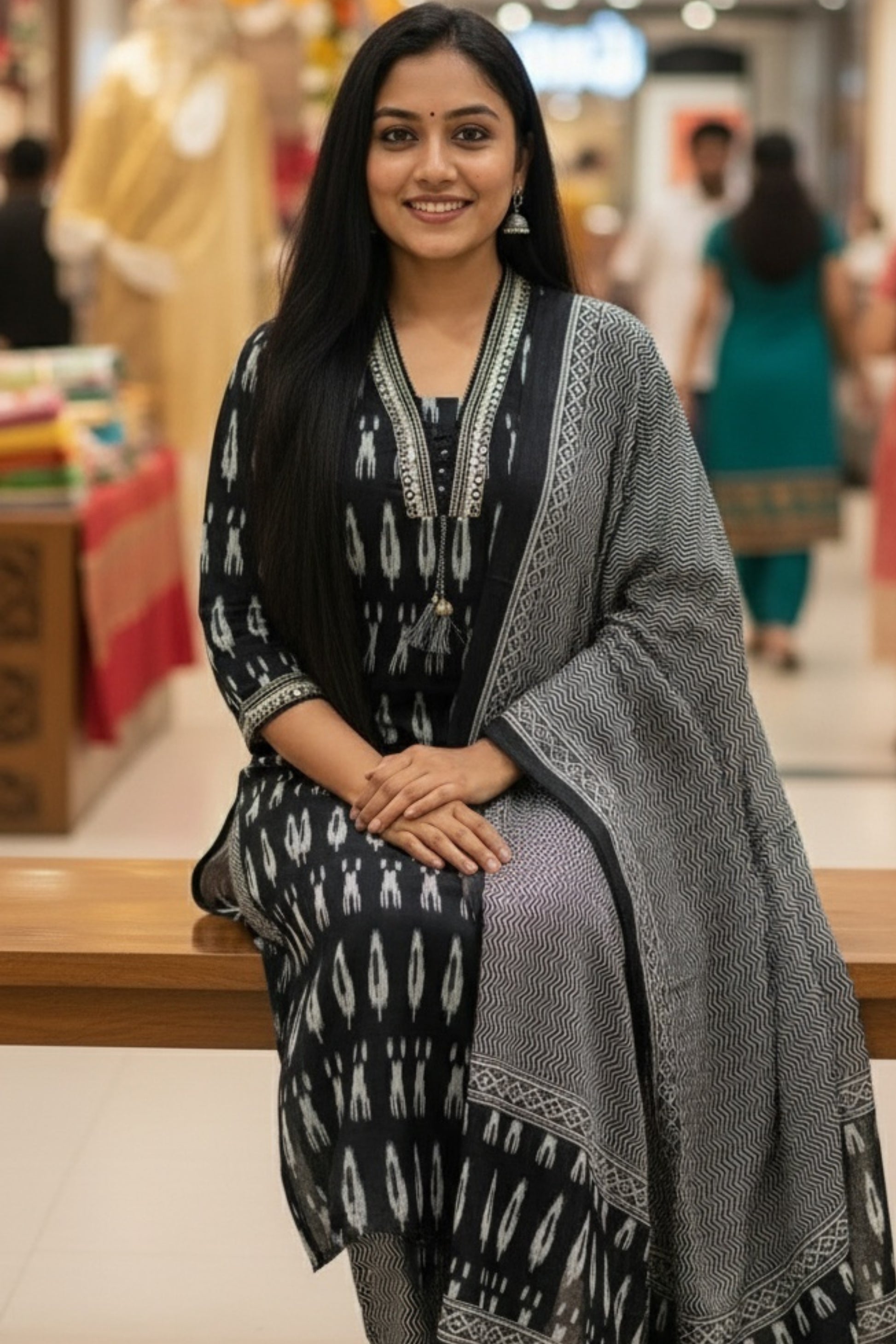 Black Monochrome Ikat Cotton Kurta Pant Set with Matching Dupatta