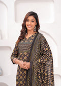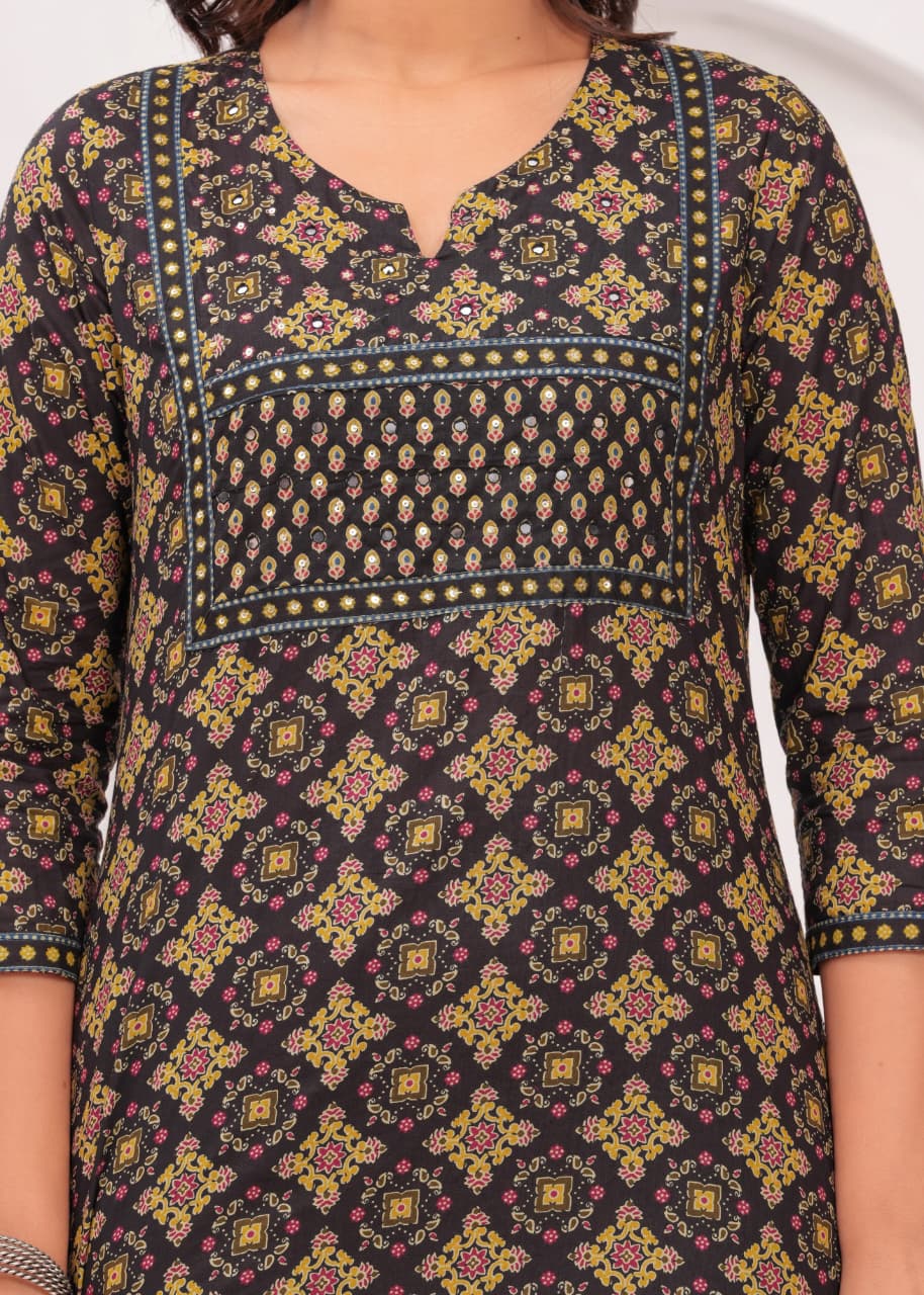 Black & Mustard Printed Kurta Set with Printed Border Dupatta