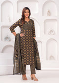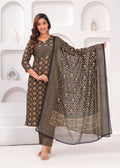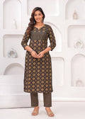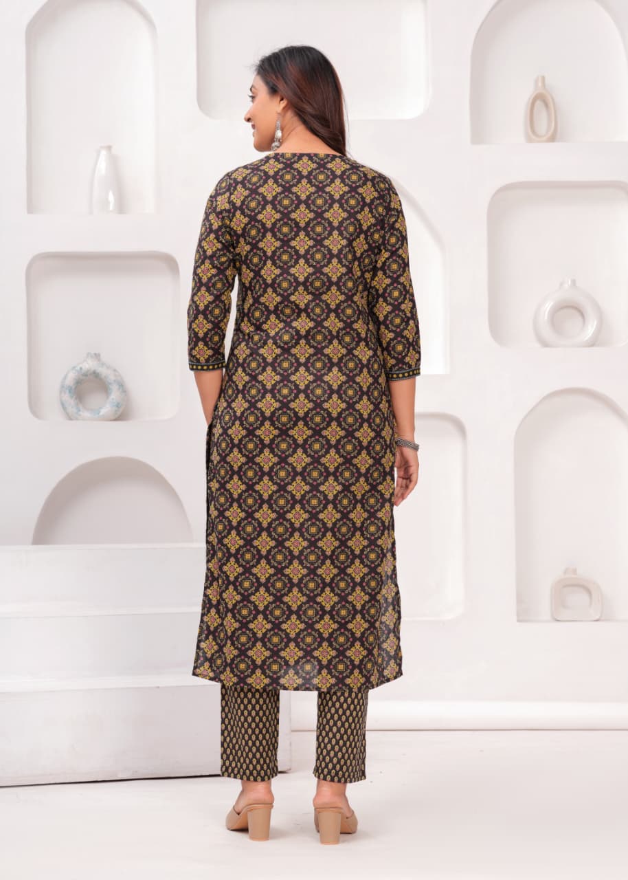 Heritage vibes, modern ease—this set brings the best of both. A calf-length straight kurta in black and mustard features an elegant V-notch neckline, defined yoke panel, and 3/4 sleeves finished with contrast borders. The print story blends classic jaal and buta motifs in warm, festive tones that flatter every skin shade. Paired with coordinated straight pants (clean front, elasticated back for comfort) and a lightweight, fluid printed border dupatta, it’s effortless to wear and easy to style.