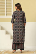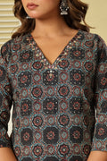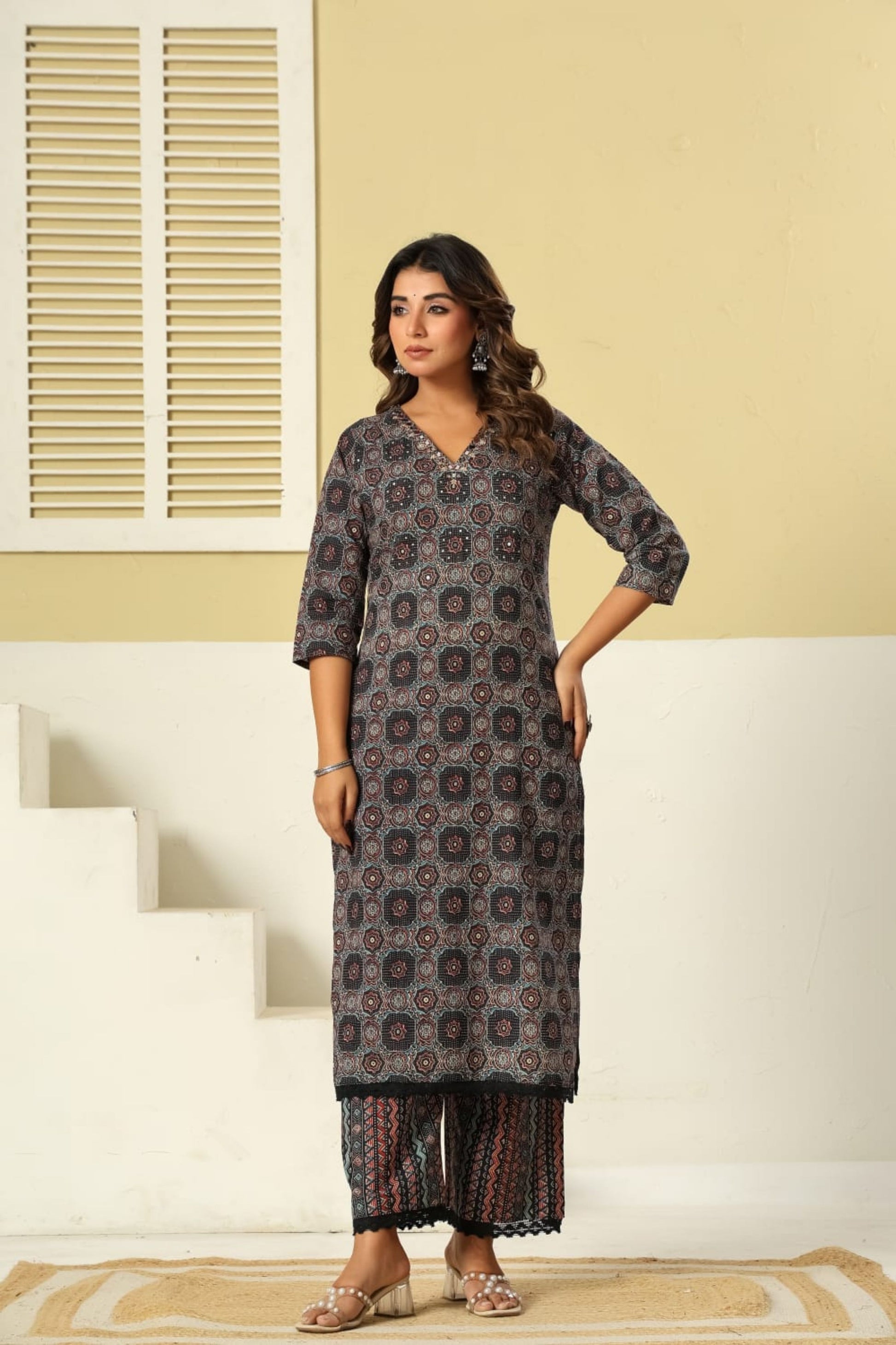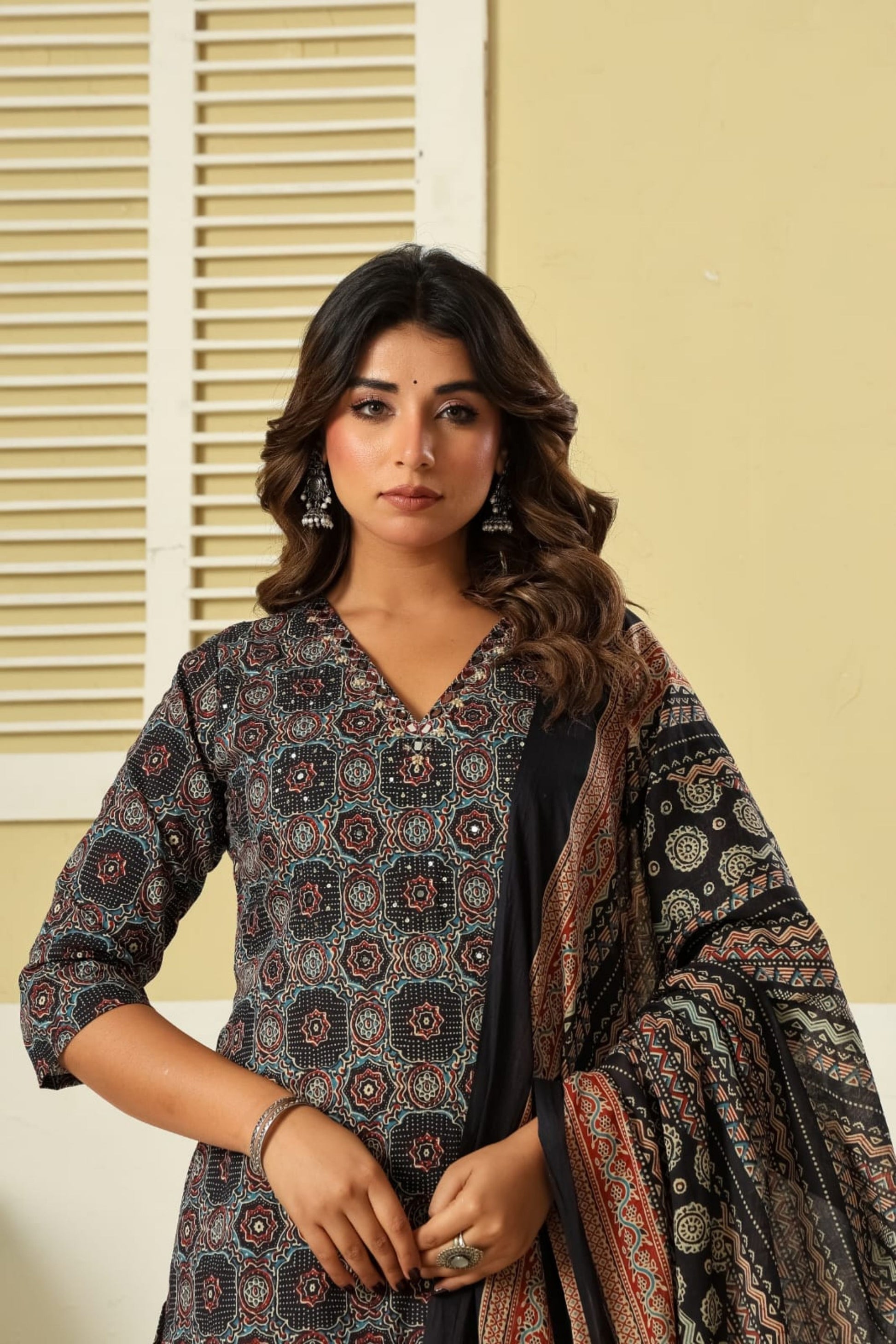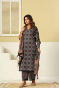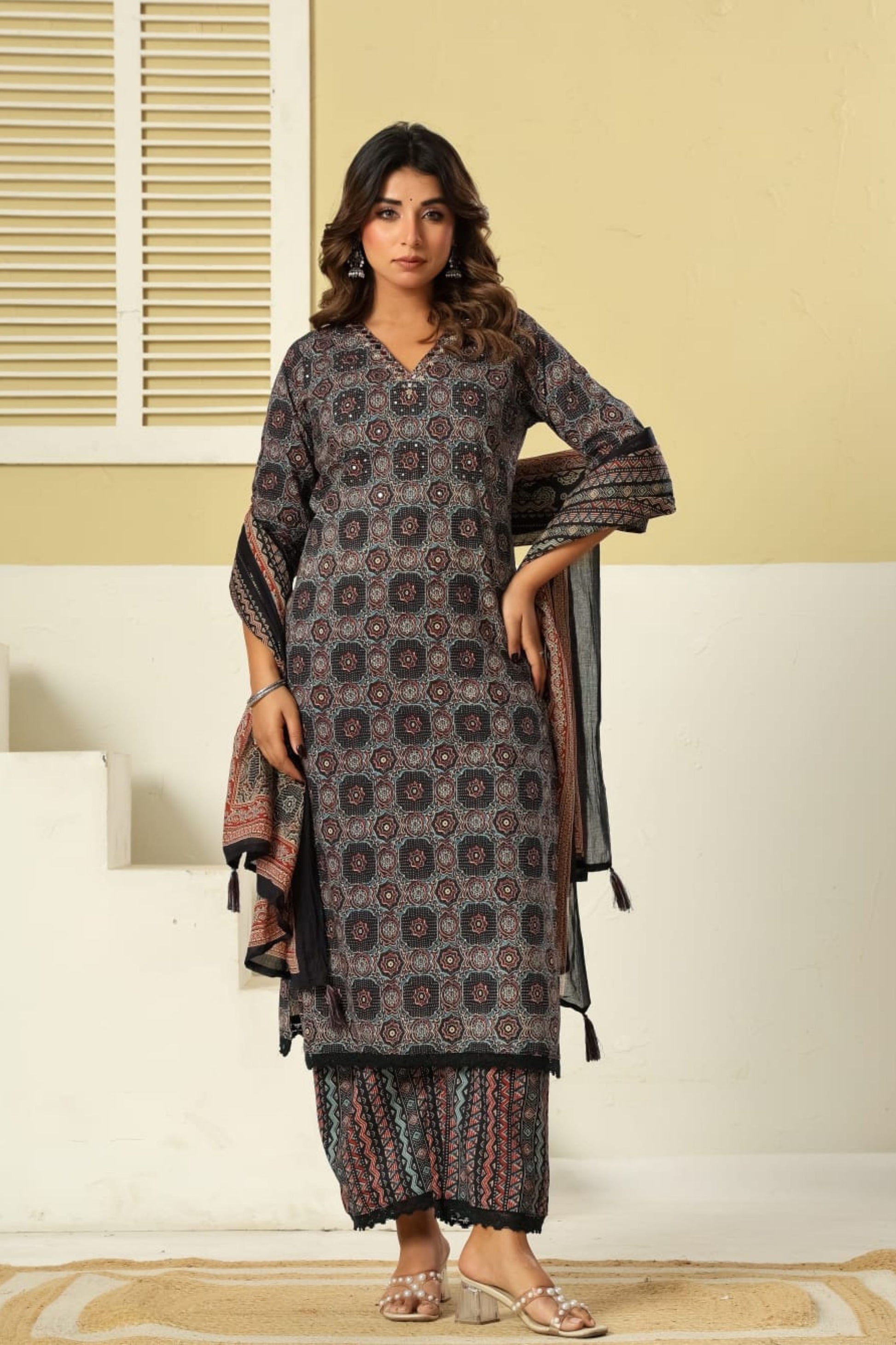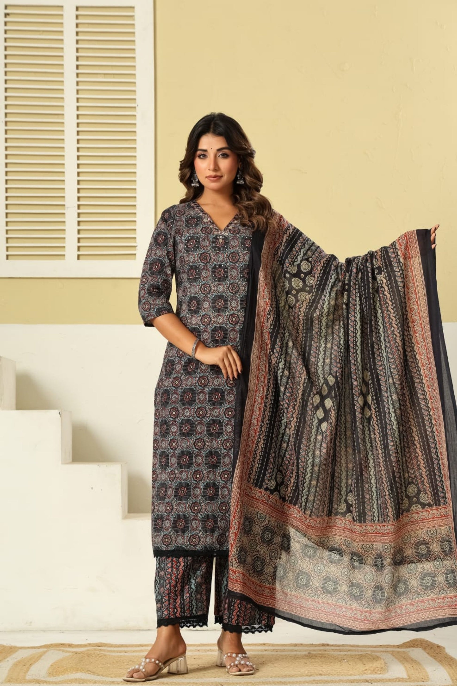 This black printed 3-piece suit set features a beautifully tailored kurta paired with matching pants and a coordinated dupatta. The elegant black base enhanced with intricate traditional prints creates a sophisticated and timeless ethnic look, perfect for everyday wear, casual outings, and small gatherings. Crafted from soft and breathable cotton fabric, this set offers all-day comfort with a relaxed and flattering fit. The printed dupatta with detailed border patterns adds a stylish and traditional touch to the overall ensemble. Classic, comfortable, and effortlessly graceful, it is an ideal choice for elegant ethnic dressing.