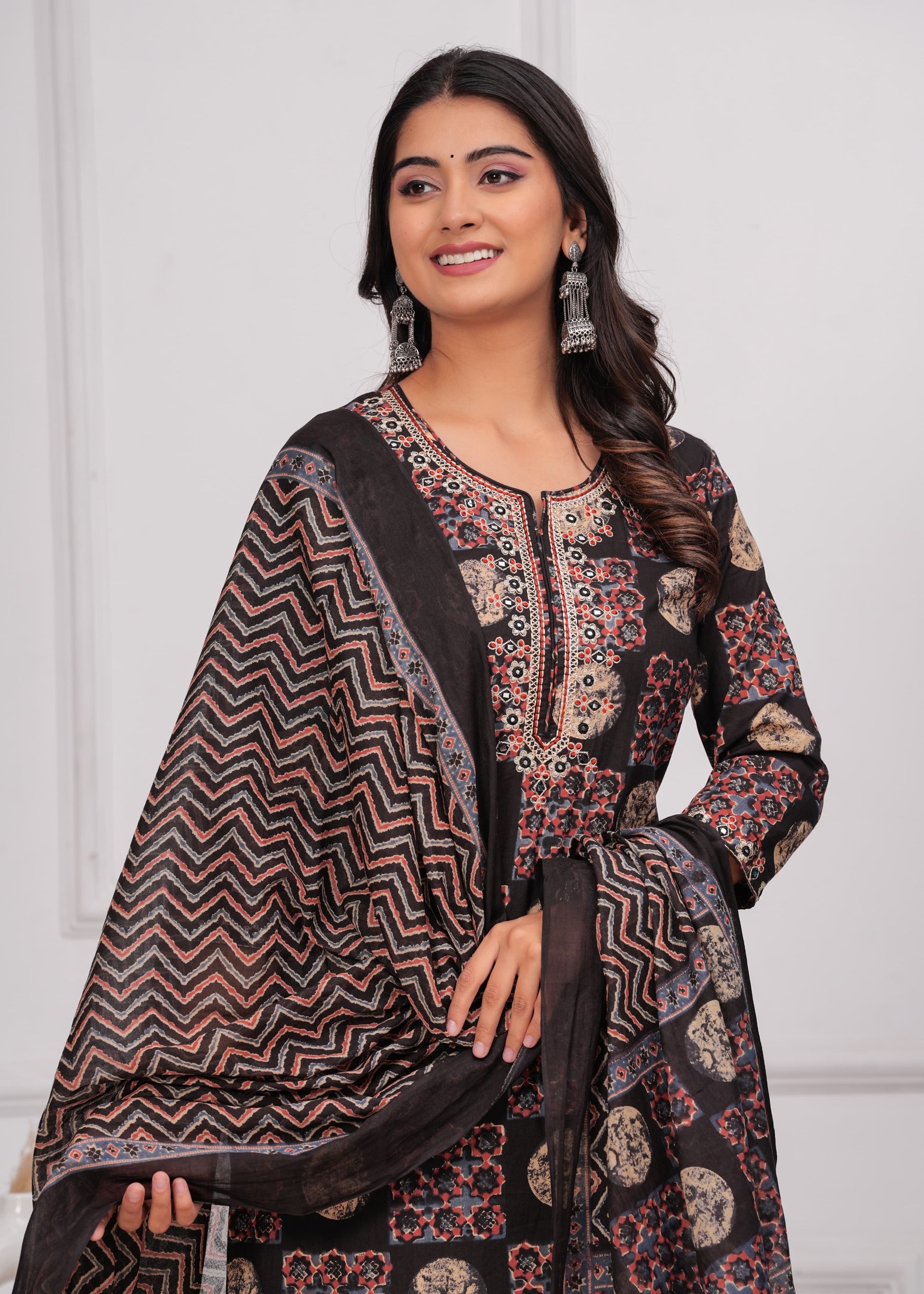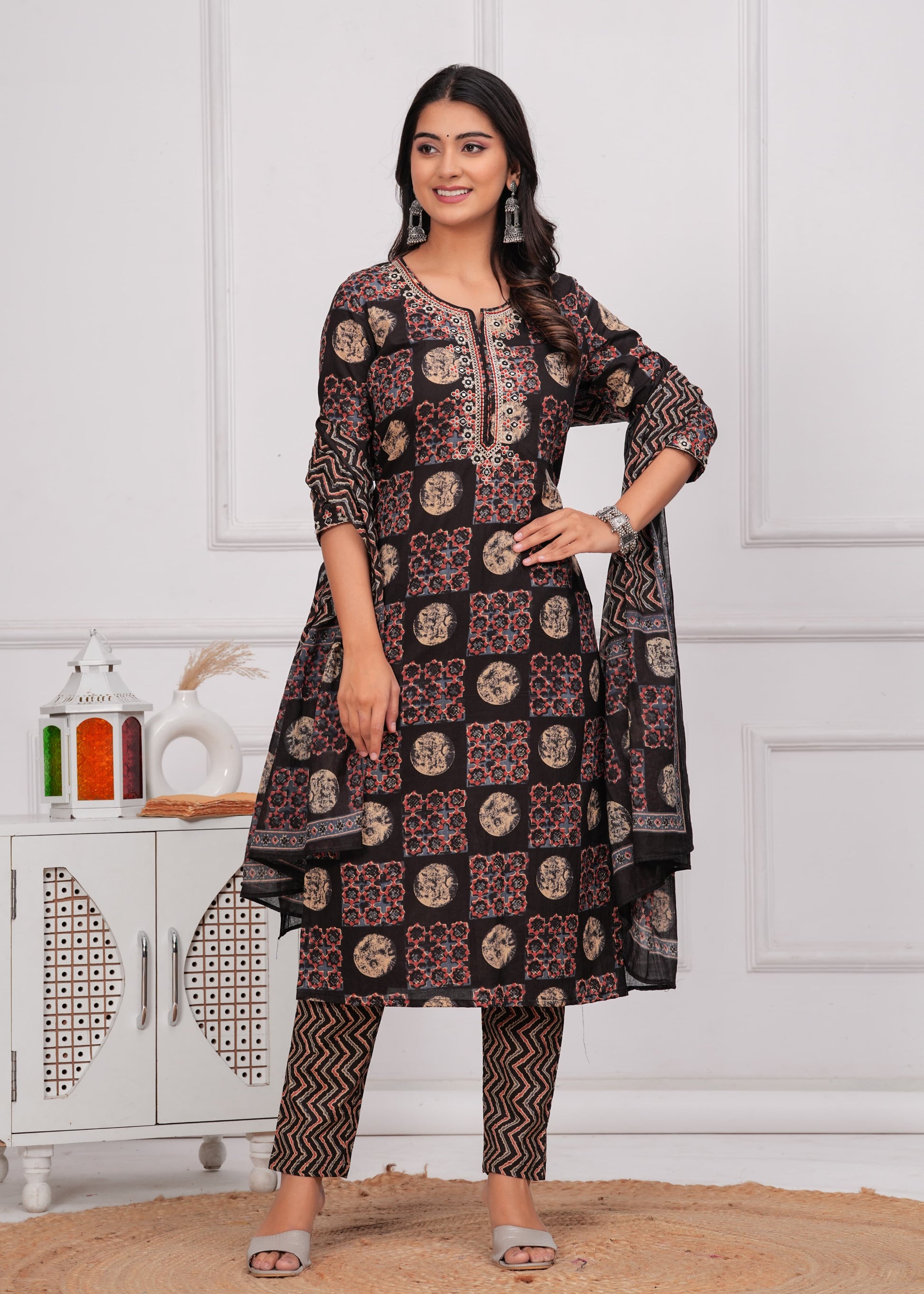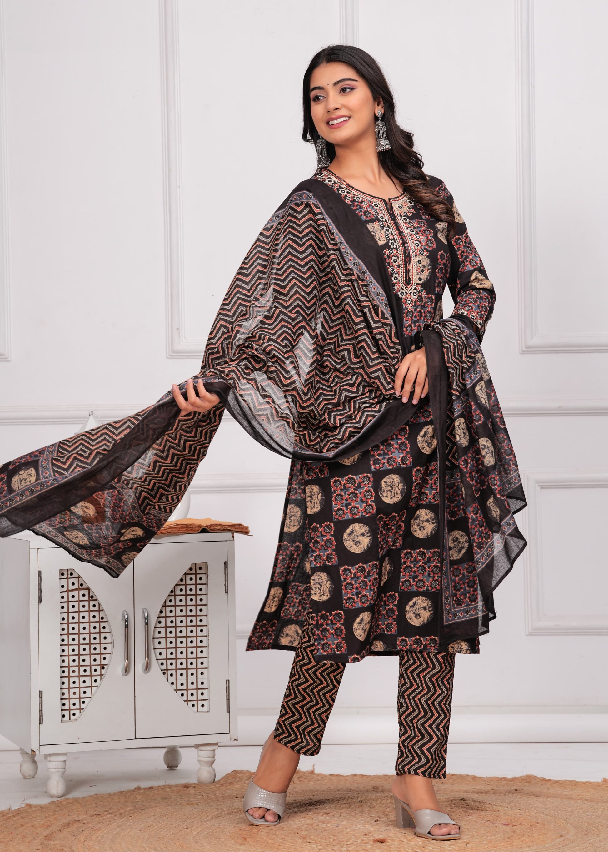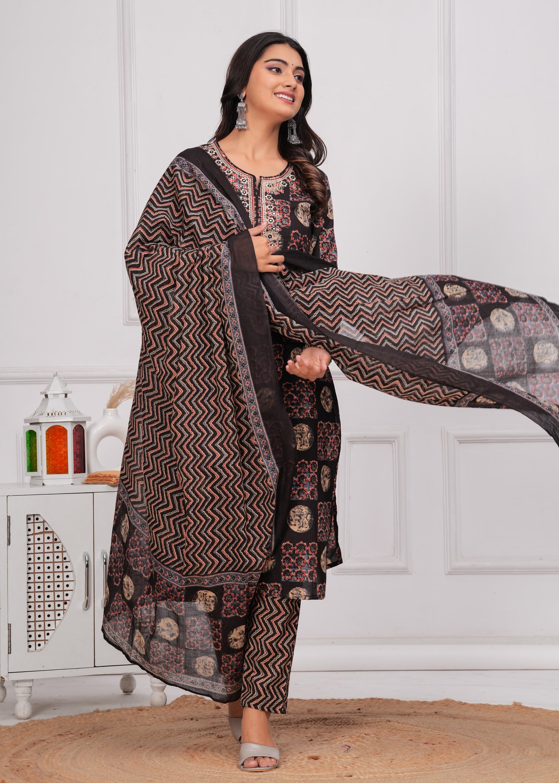 Black & Rust Geometric Print Cotton Kurta Pant Dupatta Set