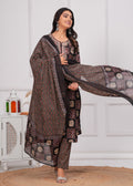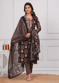 Step out in style with this Black & Rust Geometric Print Cotton Suit Set. The kurta features a unique block-inspired geometric print with hints of rust and beige, beautifully paired with chevron-patterned pants and a matching dupatta. Crafted from breathable cotton, this set is perfect for casual outings, festive gatherings, or office wear, combining traditional design with everyday comfort.