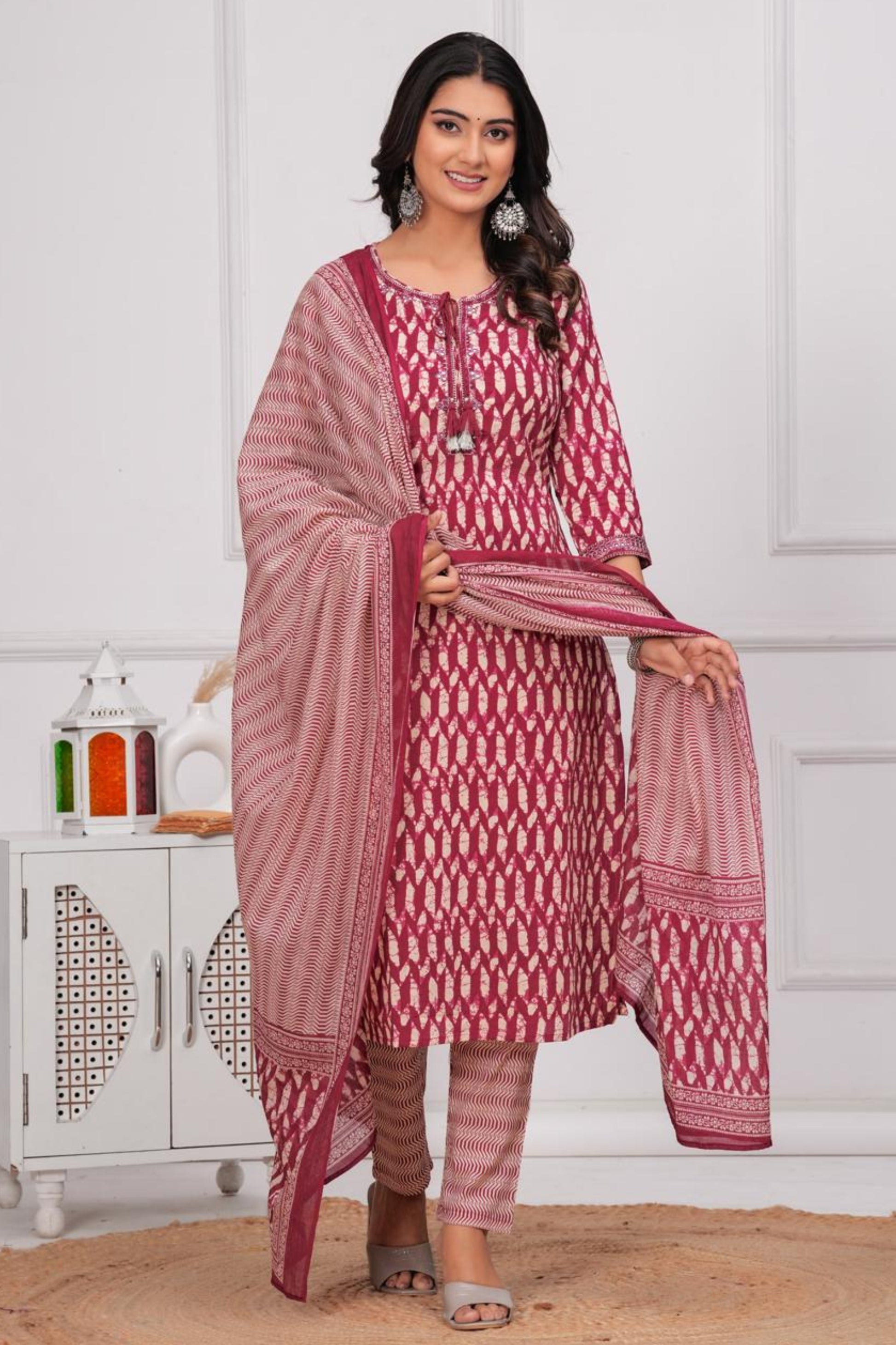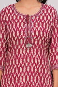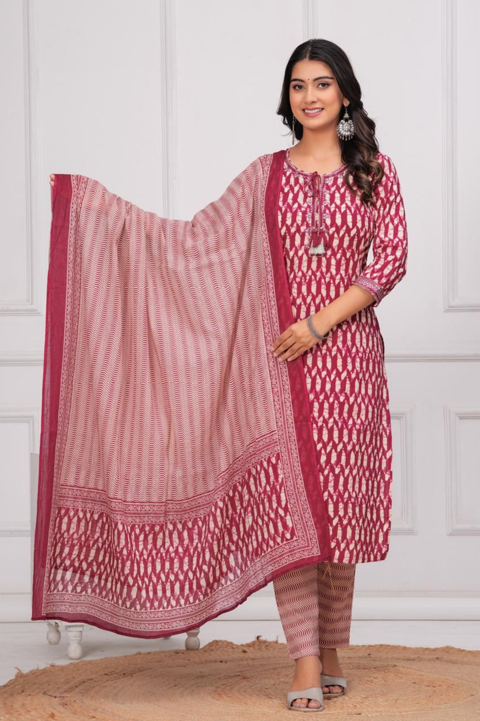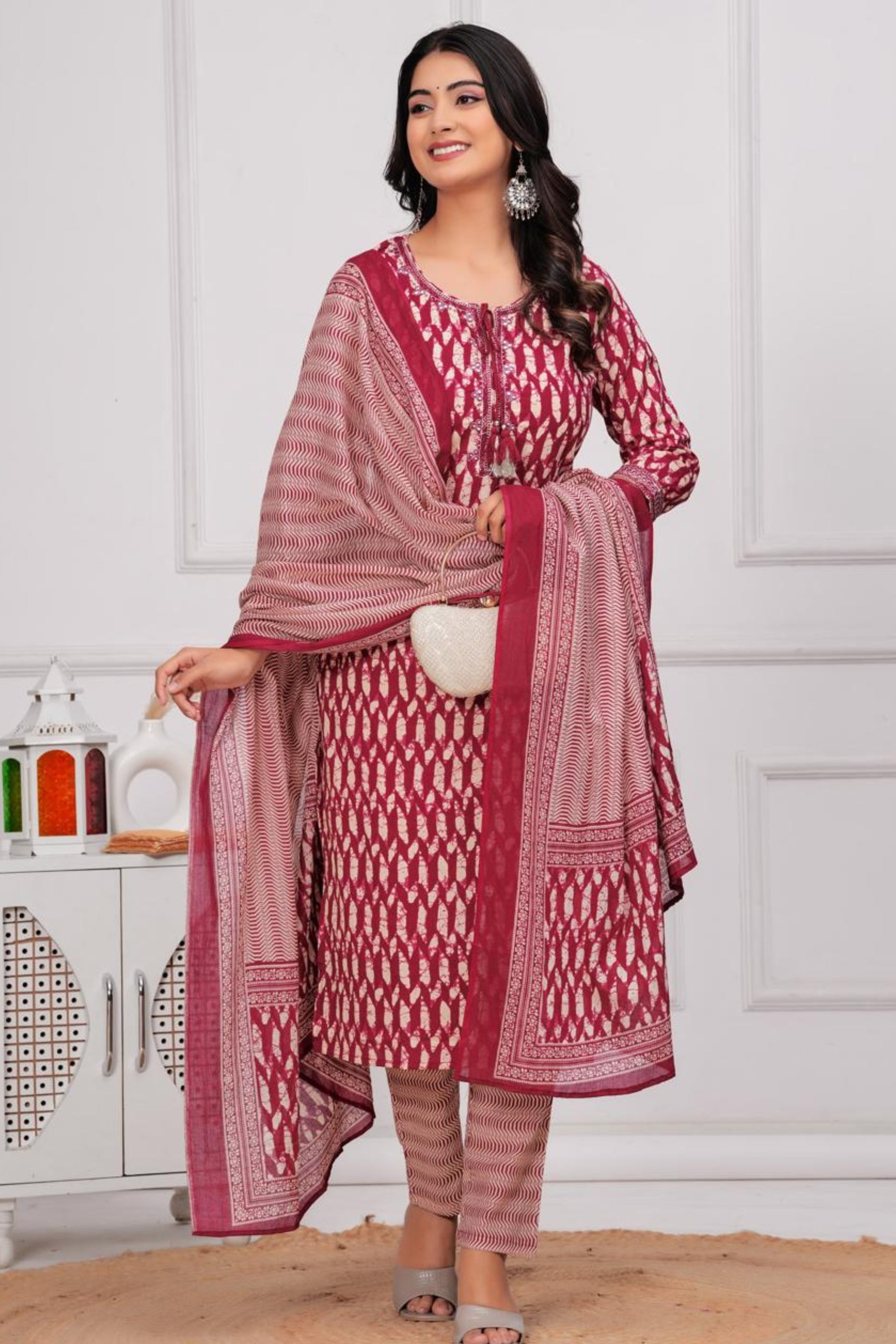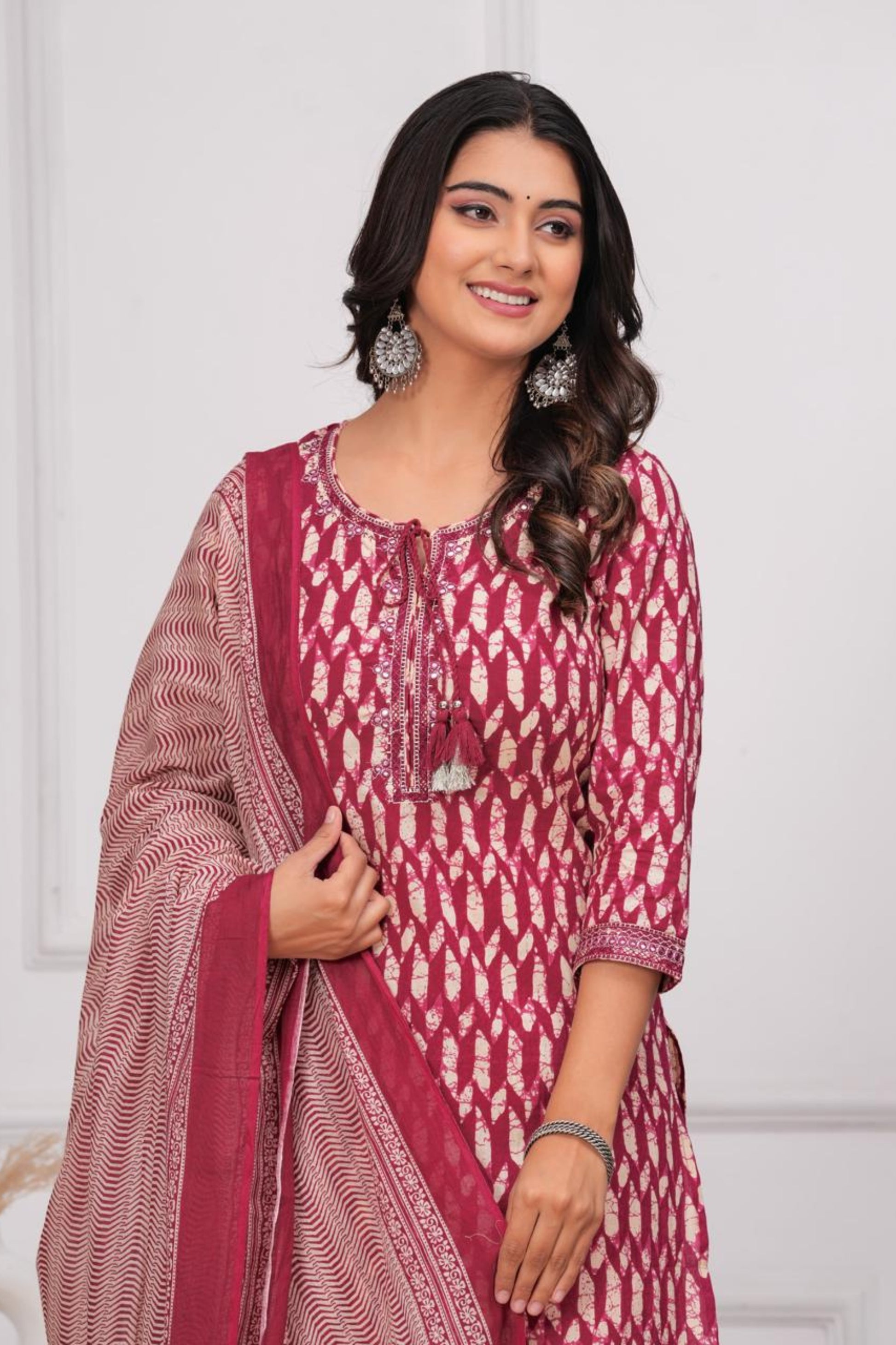Step into effortless festive charm with our Boho Maroon Kurta Set with Tassel Detailing & Cotton Dupatta. Crafted from breathable cotton, this kurta features a vibrant maroon base with handprinted patterns that radiate elegance and ease. The neckline is adorned with delicate embroidery and playful tassel accents, adding a touch of bohemian flair. Paired with matching straight pants designed for comfort and style, this set is completed with a lightweight cotton dupatta showcasing intricate prints and borders.