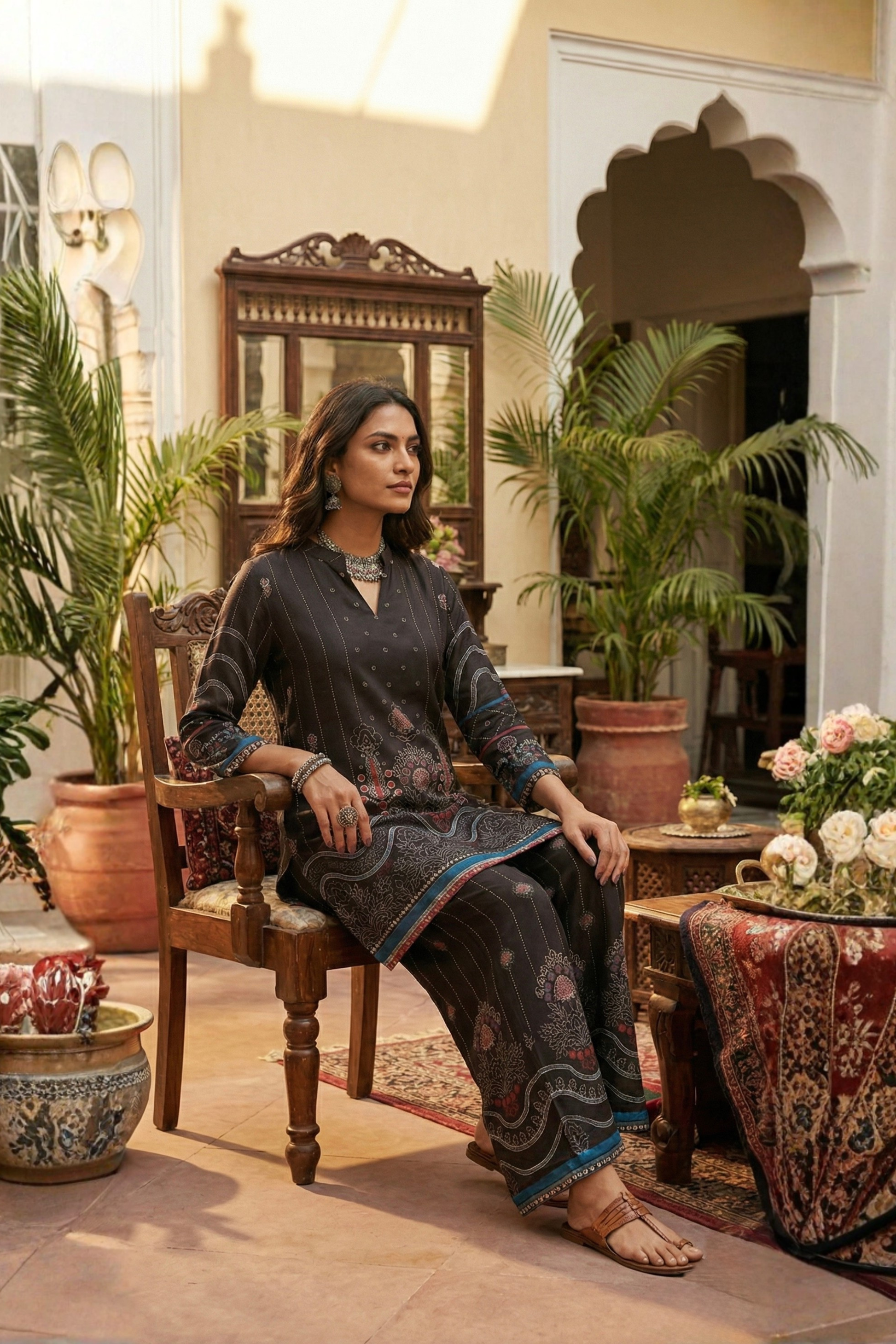 Elevate your everyday ethnic style with this brown co-ord set featuring intricate traditional prints and fine detailing. Designed with a classic notched neckline and three-quarter sleeves, it comes paired with comfortable straight-fit printed pants for a coordinated look. Ideal for office wear, festive gatherings, and elegant casual occasions