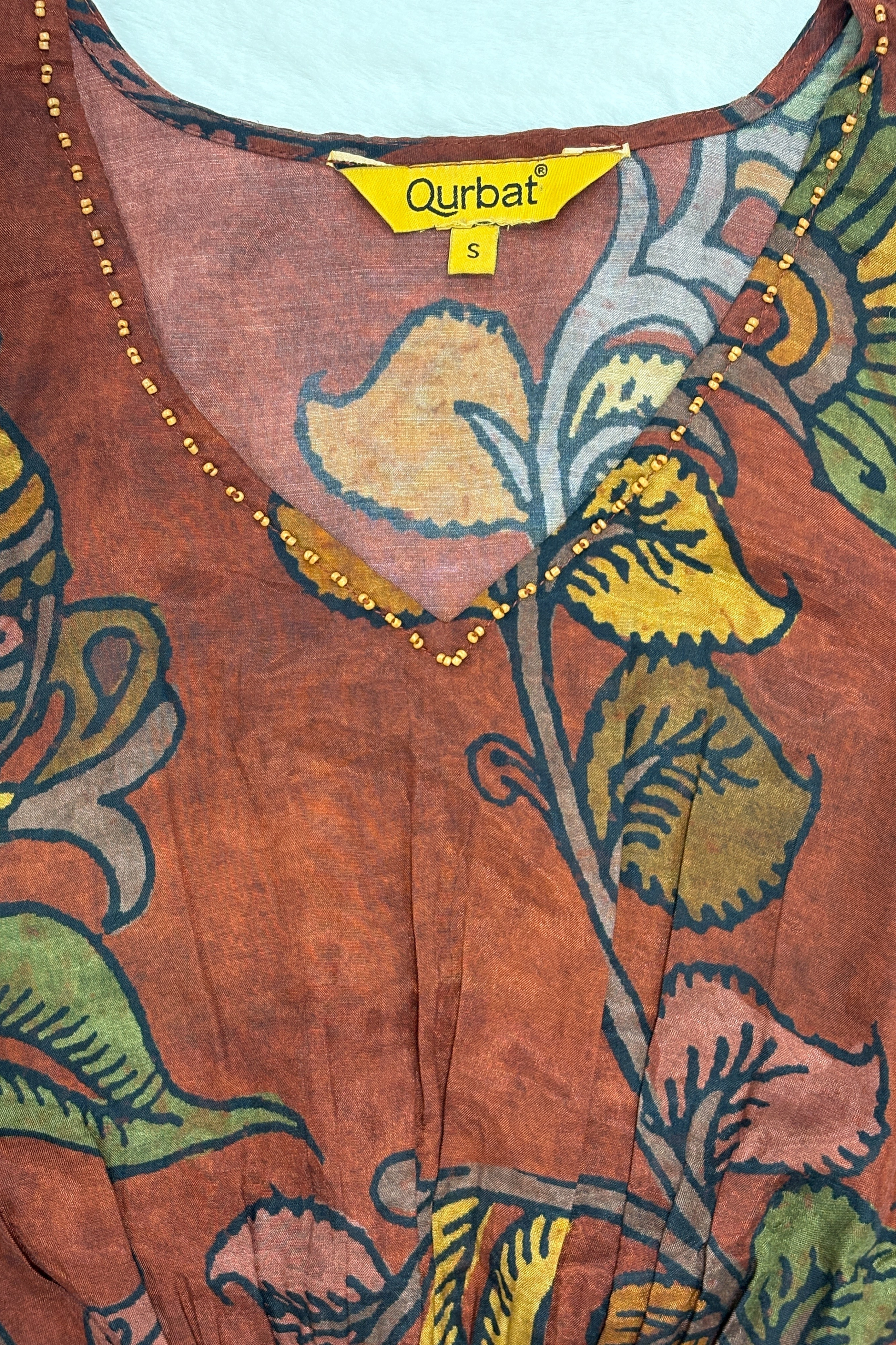 Elevate your everyday ethnic style with this brown kaftan dress adorned with intricate traditional prints. Designed with a graceful V-neckline and flowy three-quarter sleeves, it features a softly gathered waist that creates a flattering flared silhouette. Perfect for festive gatherings, casual outings, and elegant daytime wear.