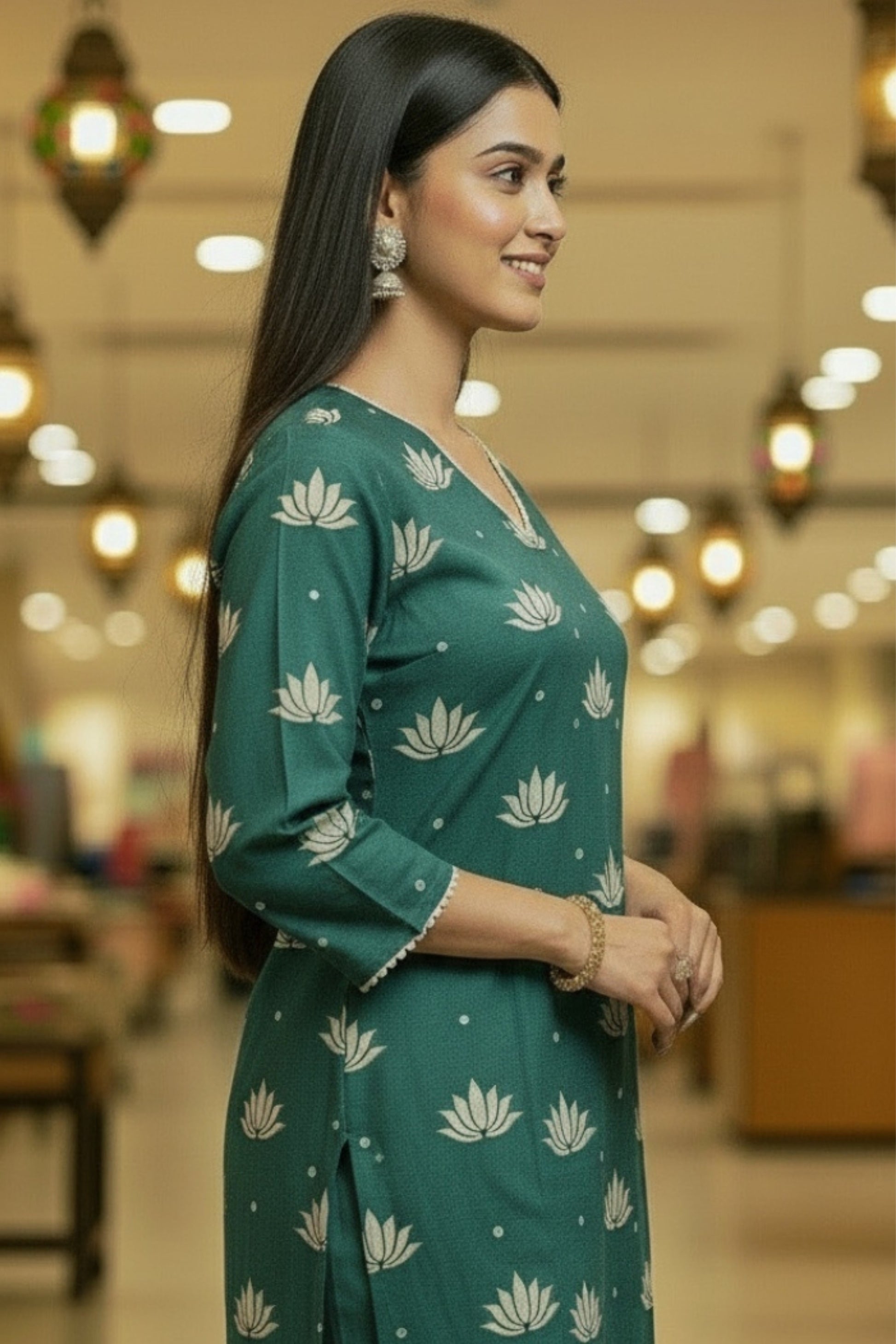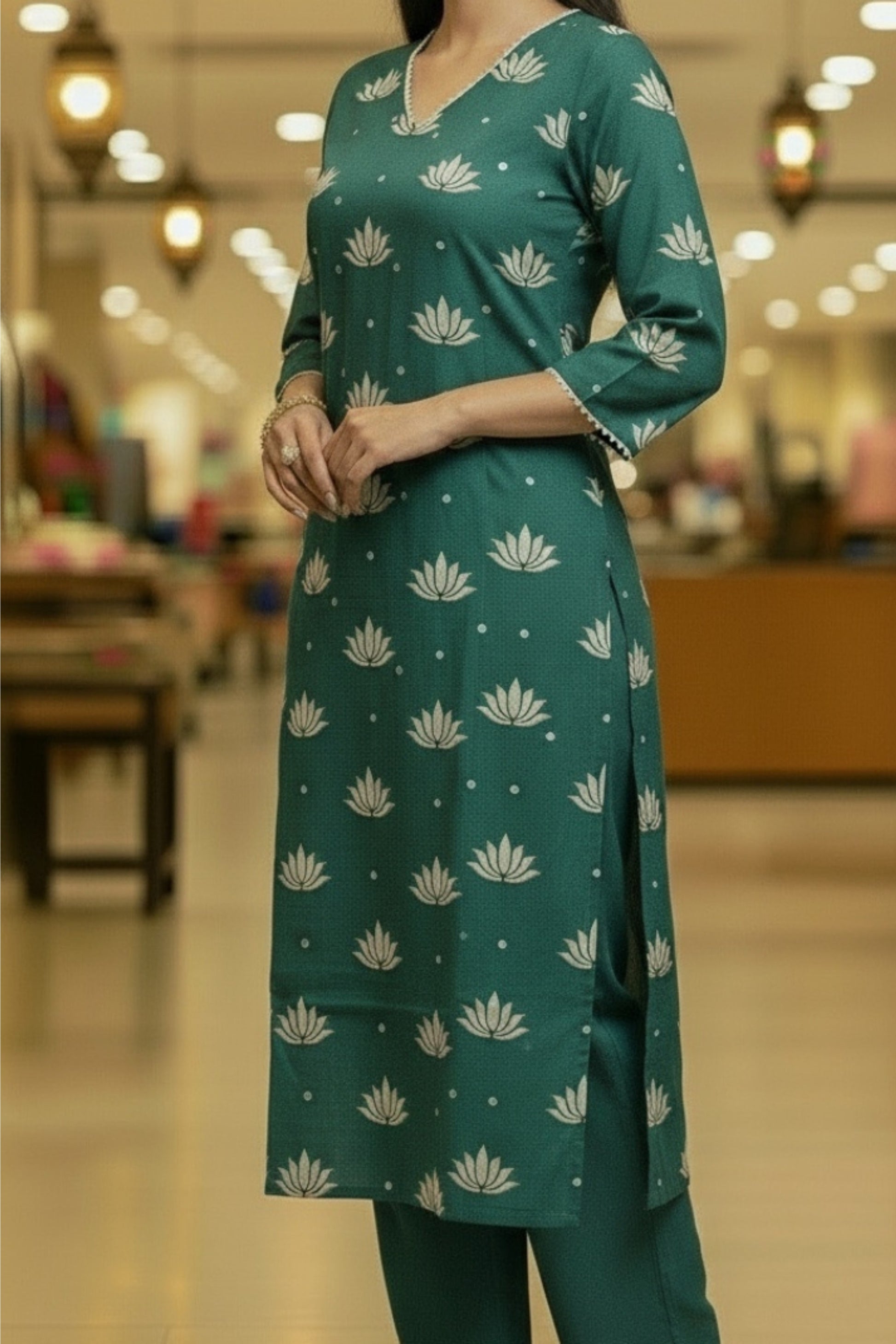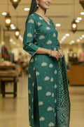 Step into timeless elegance with this Dusty Blue Cotton Kurta Set, adorned with delicate golden lotus motifs that exude grace and sophistication. Crafted from soft, breathable Chanderi, this set is designed to keep you comfortable while elevating your ethnic wardrobe with its subtle charm. The kurta features a V-neckline with fine detailing and three-quarter sleeves, beautifully enhanced with golden lotus prints that add a touch of festive shimmer. Paired with solid cotton pants for ease of movement, the outfit strikes the perfect balance between comfort and tradition. The matching dupatta, highlighted with geometric-inspired prints, completes the look with an elegant drape.