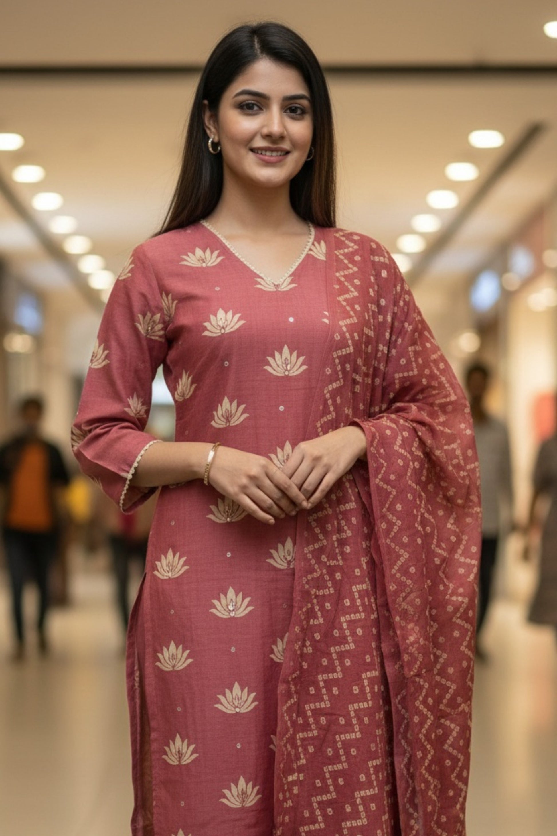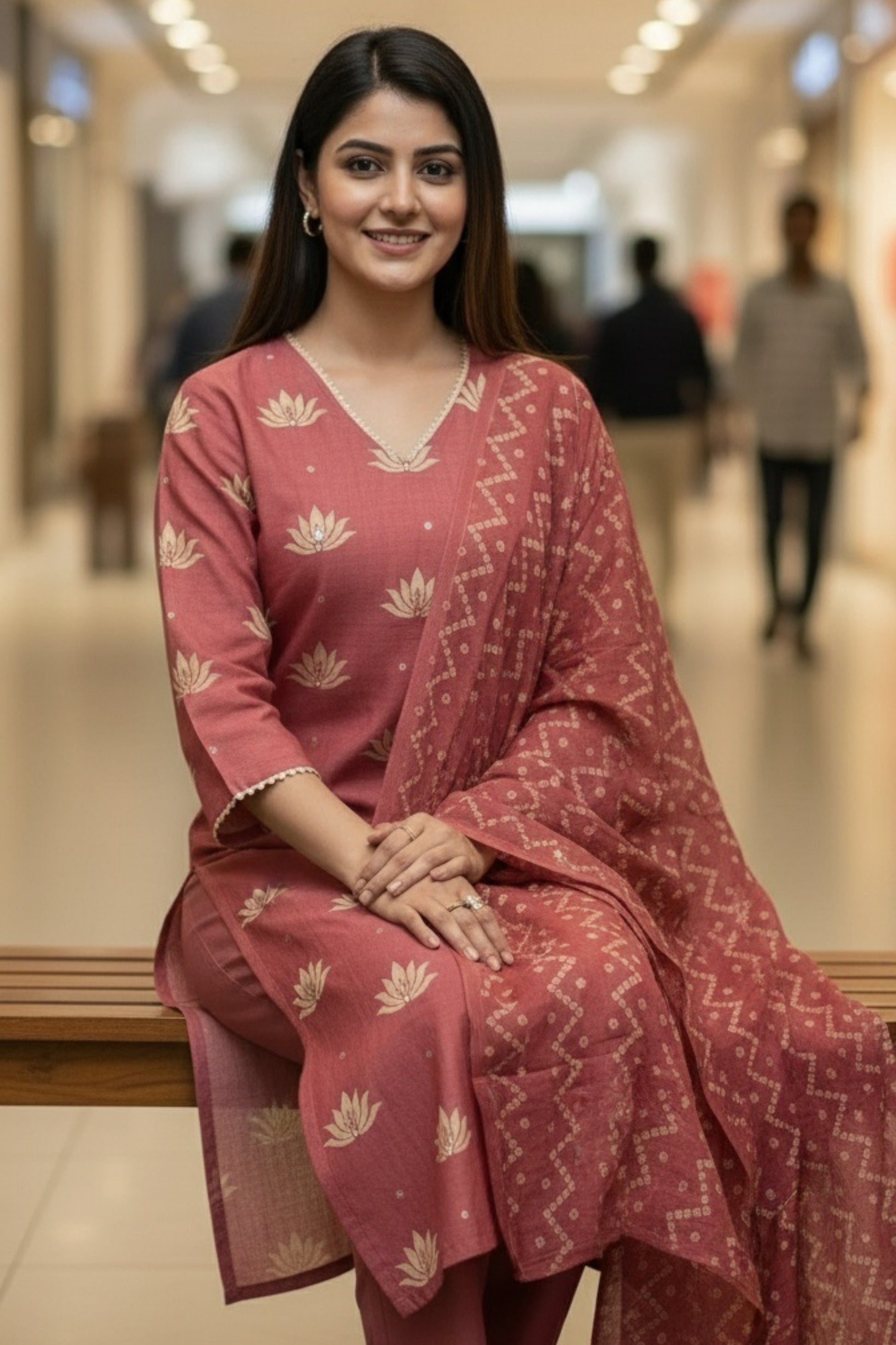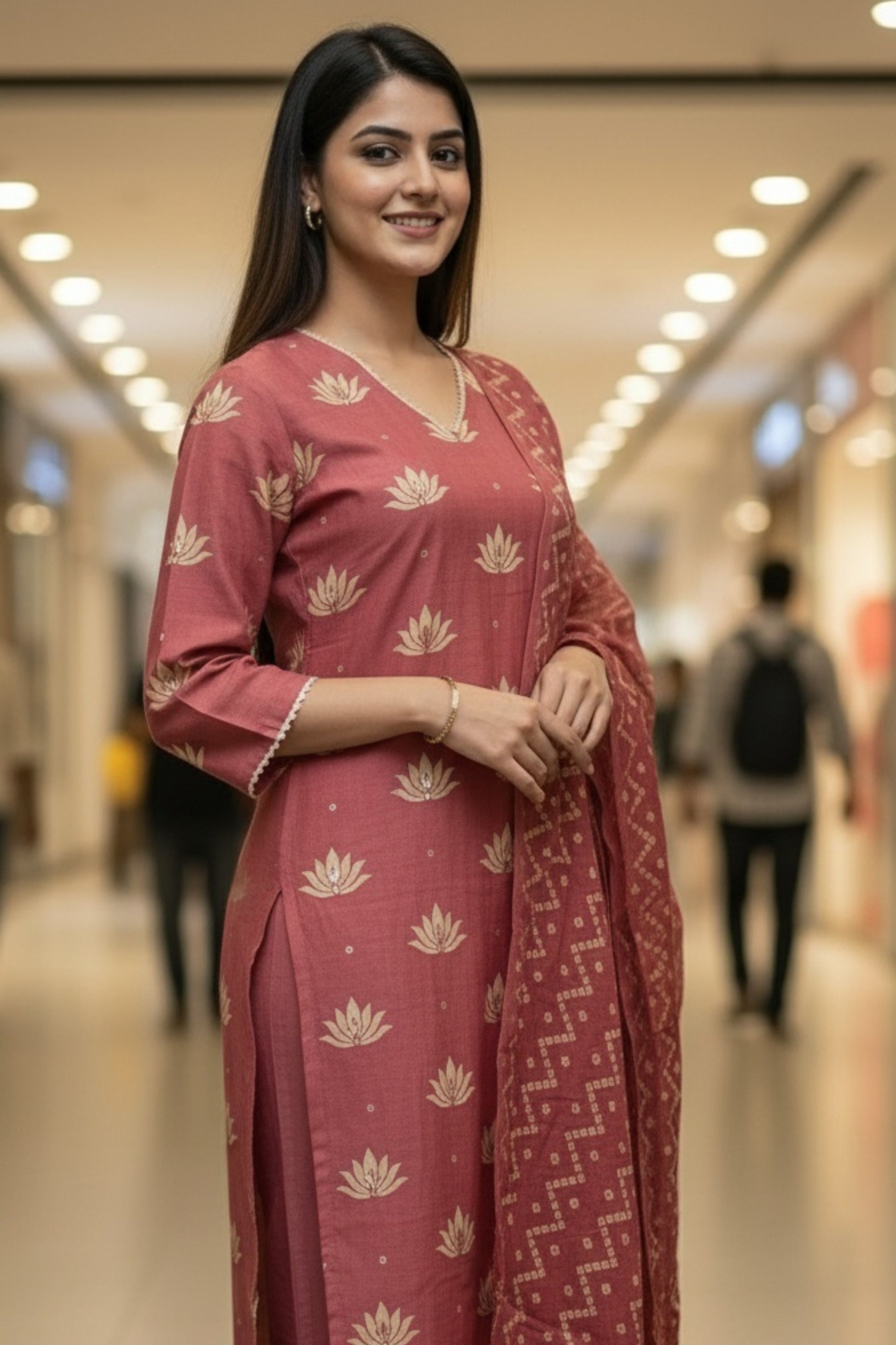 Step into timeless elegance with this Dusty Rose Cotton Kurta Set, adorned with delicate golden lotus motifs that exude grace and sophistication. Crafted from soft, breathable Chanderi, this set is designed to keep you comfortable while elevating your ethnic wardrobe with its subtle charm. The kurta features a V-neckline with fine detailing and three-quarter sleeves, beautifully enhanced with golden lotus prints that add a touch of festive shimmer. Paired with solid cotton pants for ease of movement, the outfit strikes the perfect balance between comfort and tradition. The matching dupatta, highlighted with geometric-inspired prints, completes the look with an elegant drape.