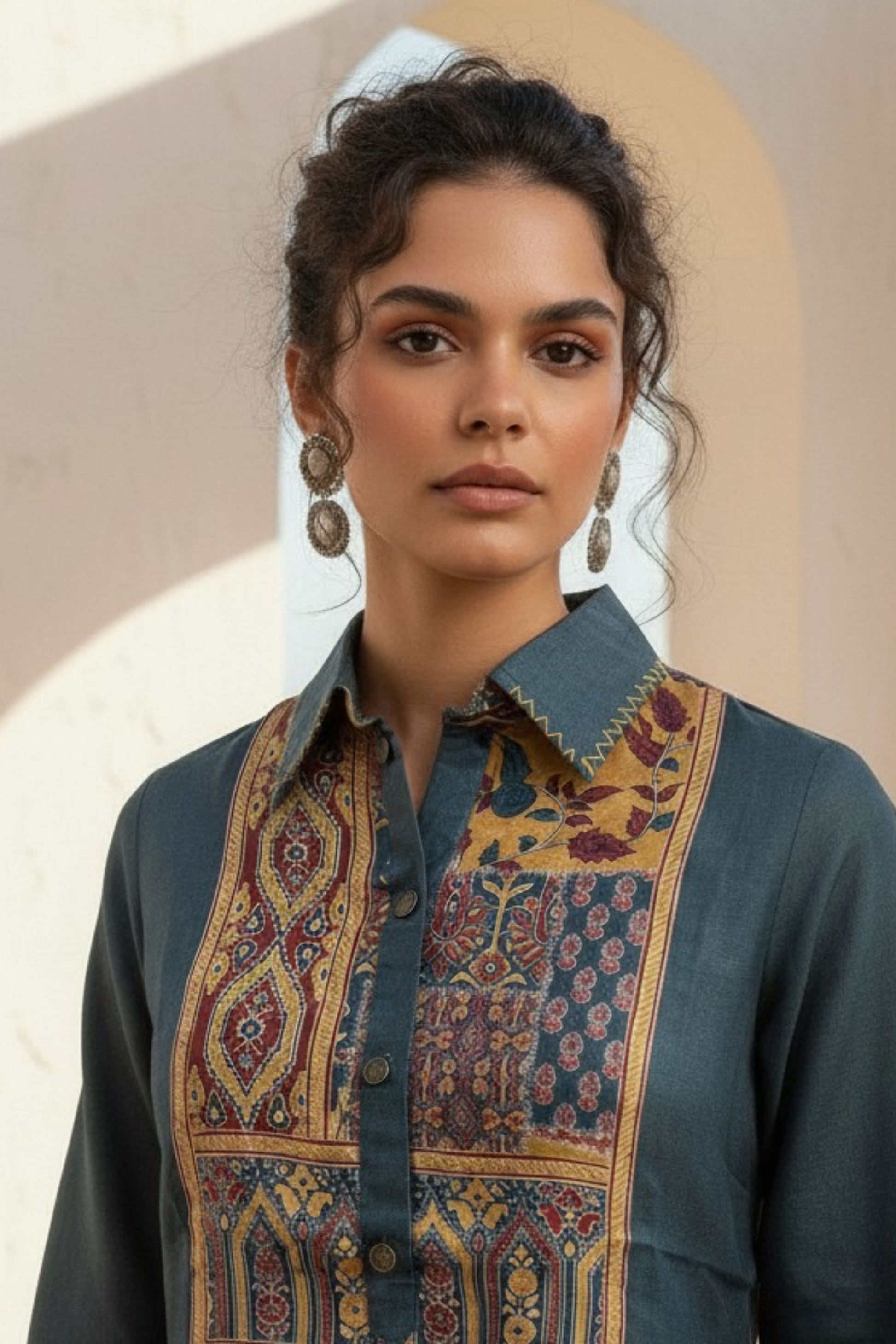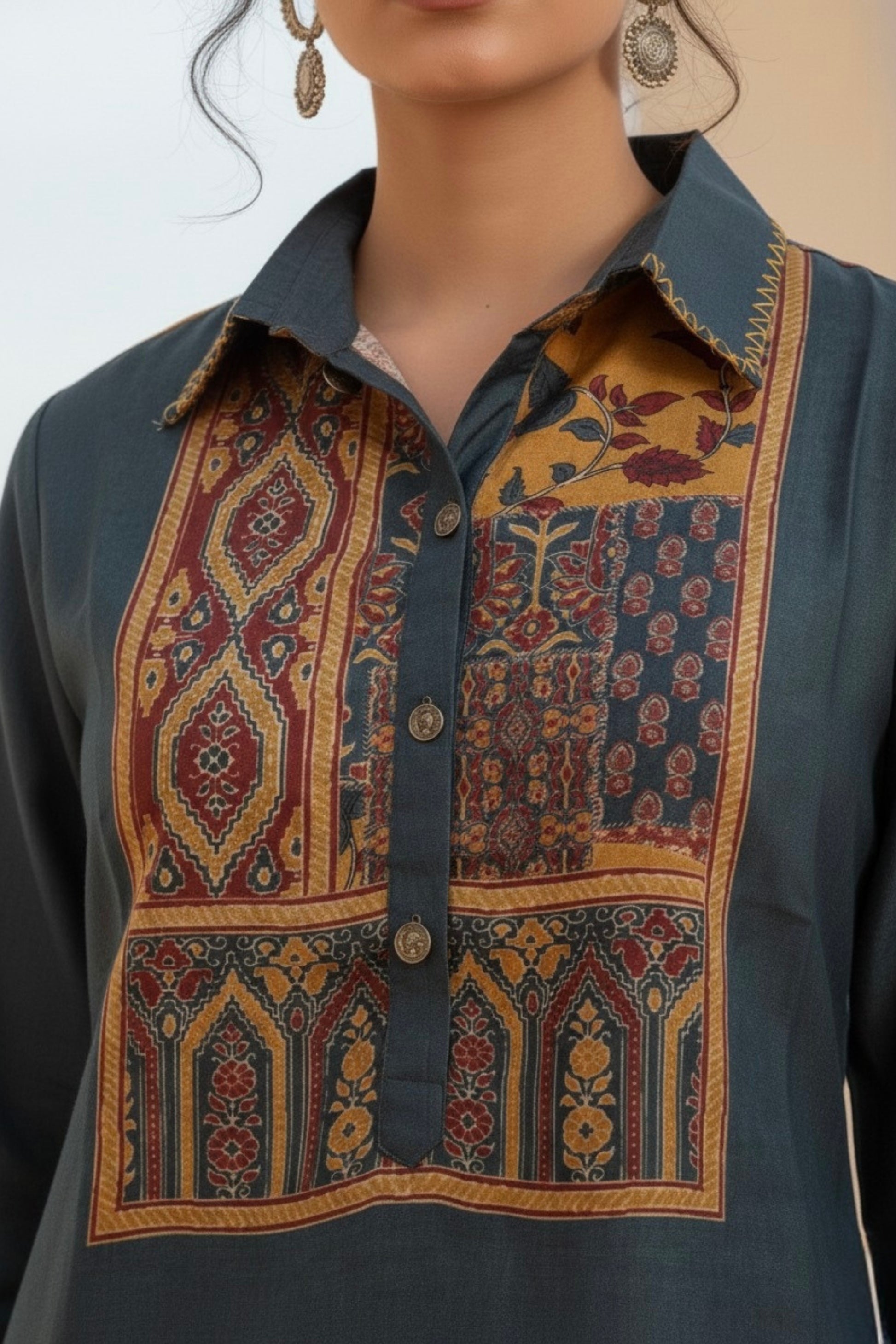 Elevate your ethnic wardrobe with this elegant dark grey co-ord set featuring intricate heritage-inspired prints on the yoke and coordinated detailing throughout. Designed in rich earthy tones with a structured yet comfortable silhouette, it blends timeless traditional aesthetics with modern elegance, making it ideal for cultural outings and refined everyday wear.