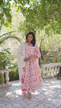 Step into effortless elegance with our beautifully crafted Cotton 3-Piece Suit Set. Featuring a charming Anarkali-style kurta adorned with delicate pink floral prints on a soft beige base, this set promises comfort and style in every stitch. The kurta is designed with a flattering V-neckline, three-quarter sleeves, and subtle side tie-ups with tassel detailing for added grace. Paired with matching straight-fit pants showcasing complementary floral embroidery and a lightweight printed dupatta bordered with intricate patterns, this ensemble is perfect for day events, festive gatherings, or casual outings. Style it with statement earrings and block heels to complete your ethnic look.