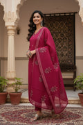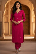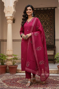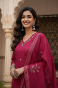 Step into timeless elegance with our Elegant Pink Cotton Embroidered 3-Piece Suit Set, crafted in breathable cotton fabric for unmatched comfort. The classic Pink base is beautifully highlighted with delicate floral hand embroidery, adding a touch of sophistication and grace to your everyday and festive wardrobe. This set includes a straight-cut kurta with detailed embroidery on the neckline and scattered floral motifs, paired with a comfortable cotton pant and a matching dupatta that completes the ethnic charm.