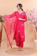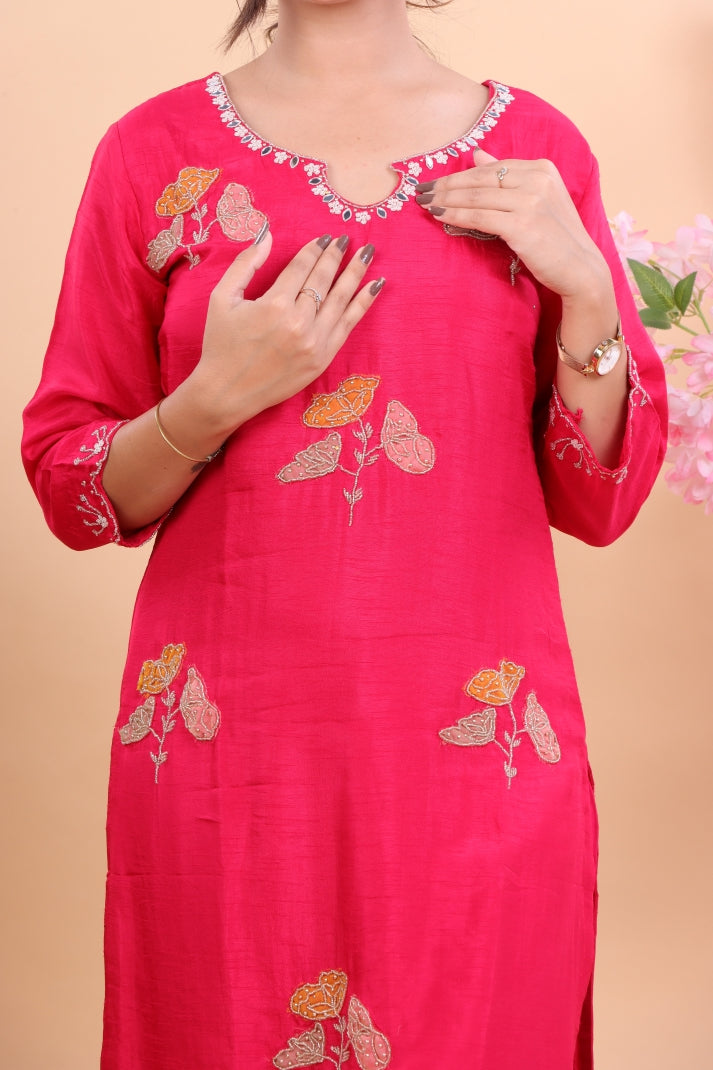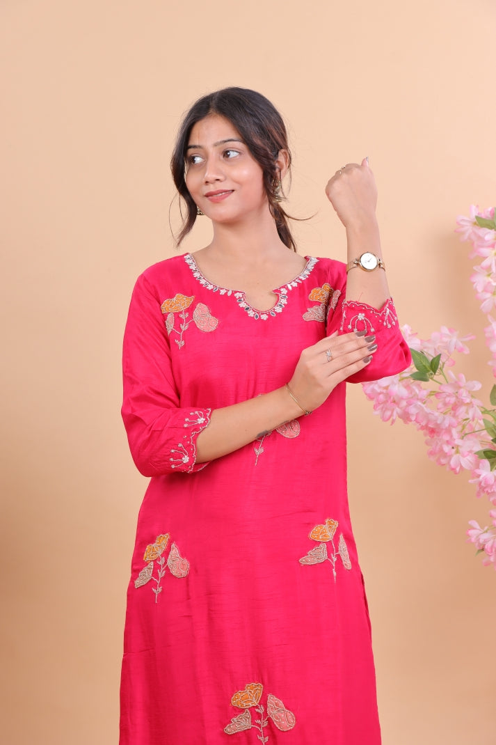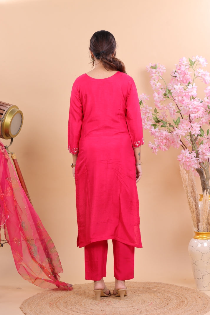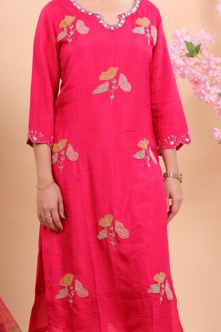 Step into timeless elegance with this Graceful Pink Silk Suit Set, crafted to add charm to your festive and special occasions. Designed in luxurious silk fabric, the suit features delicate hand-embroidered floral motifs in contrasting hues, making it stand out with refined grace. The kurta is complemented with straight pants for a polished look, while the sheer pink dupatta is adorned with intricate embroidered accents and scalloped edges, enhancing its sophistication.
