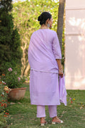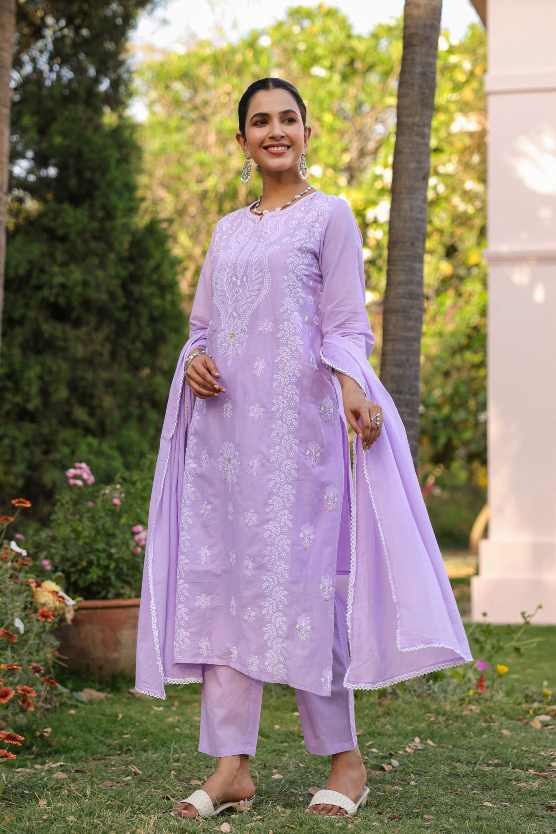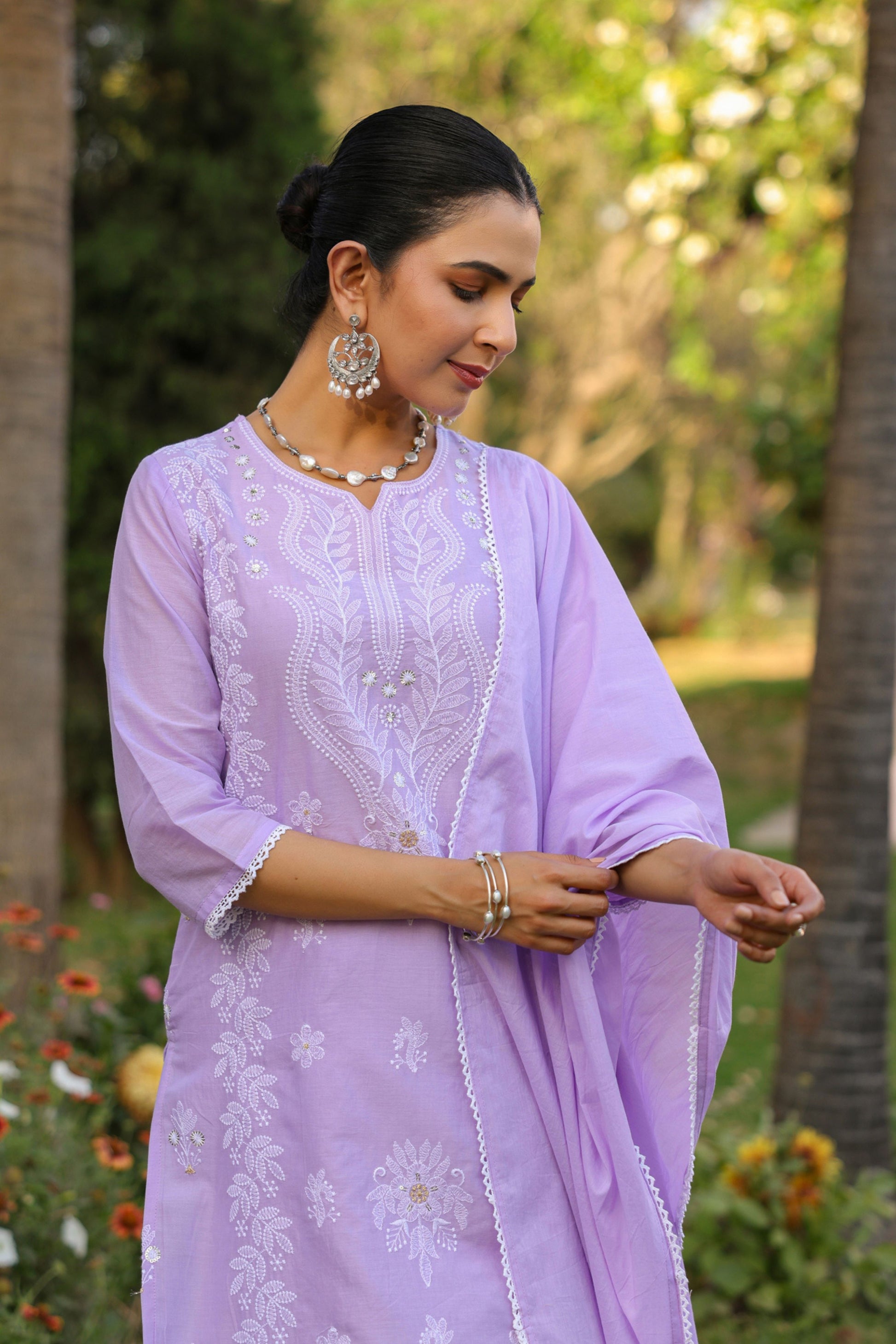 Indulge in the tranquil beauty of our Lavender Bloom Chikankari Suit Set. This graceful three-piece ensemble features a soft, light blue kurta adorned with delicate white Chikankari embroidery, paired with comfortable matching pants and a coordinating dupatta. The elegant white scalloped lace detailing on the borders of the kurta and dupatta adds a touch of refined charm. Perfect for warm days and relaxed occasions, this set offers a blend of traditional artistry and contemporary style.