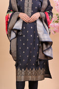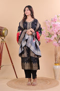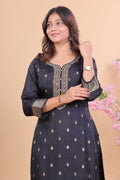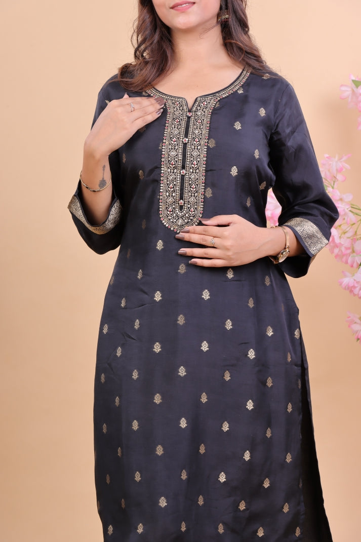 Redefine elegance with this Black Miscos Suit Set, designed for women who love to blend tradition with modern charm. The kurta comes adorned with fine zari embroidery on the neckline, cuffs, and hemline, with delicate golden woven motifs that give it a regal touch. The breathable and smooth Miscos fabric ensures all-day comfort while keeping the look rich and graceful.