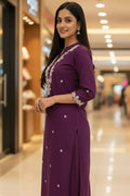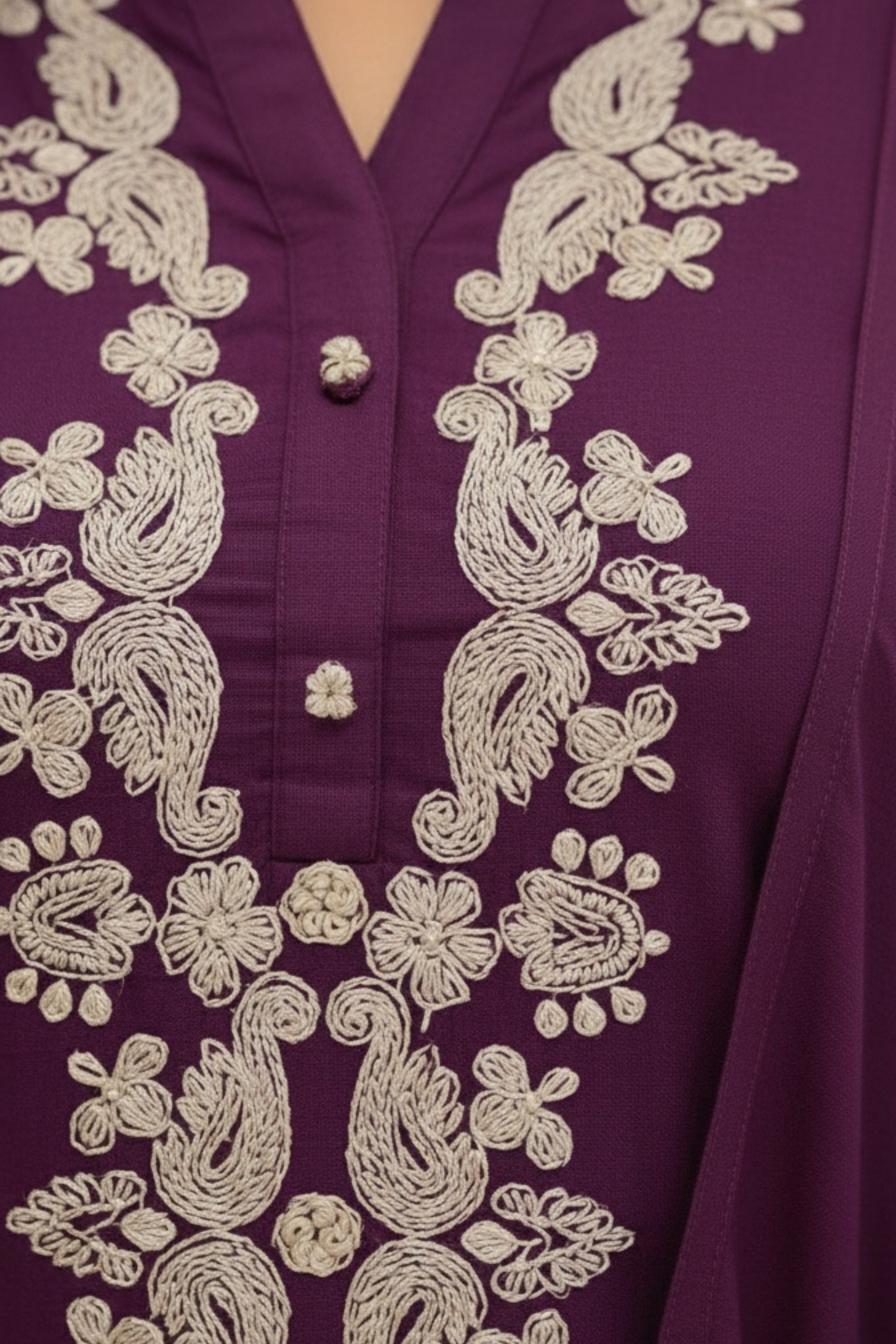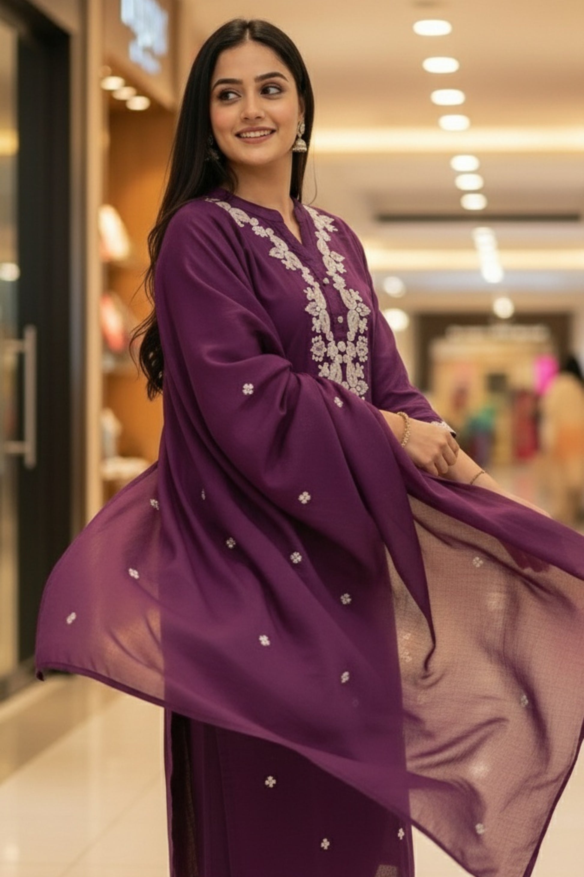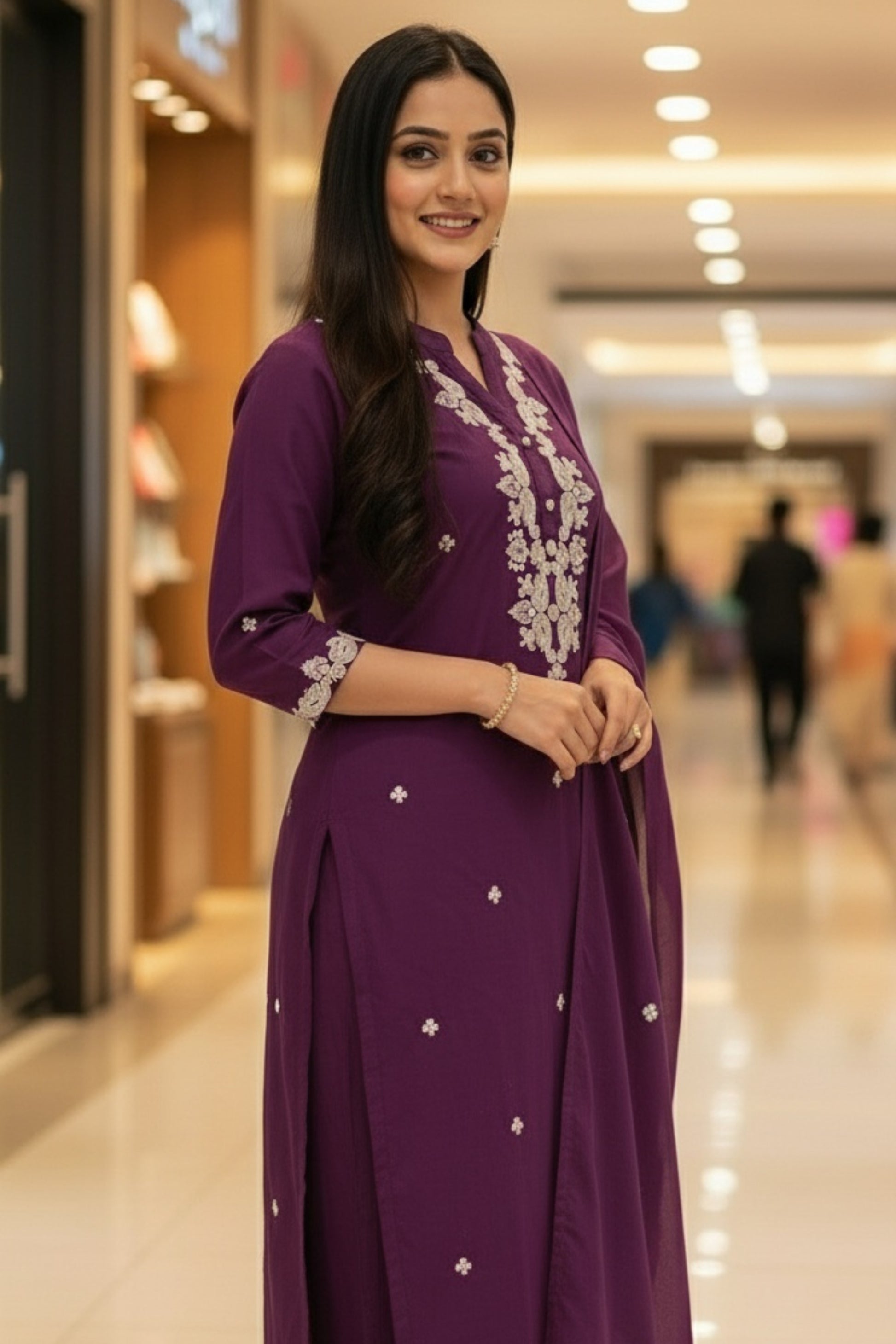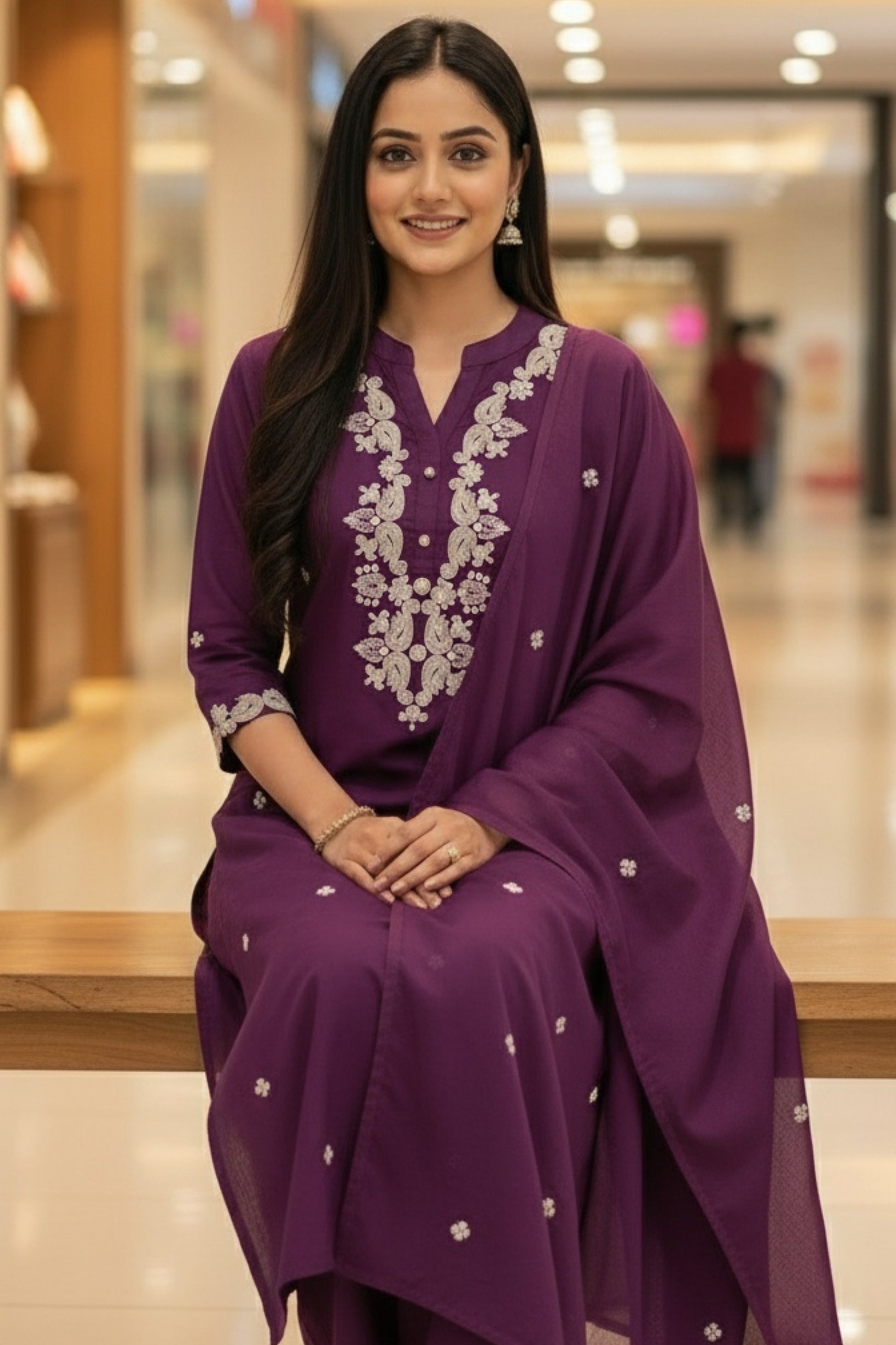 Step into timeless elegance with our Majestic Wine Kurta Pant Dupatta Set, crafted to add a royal charm to your festive and evening wear. The rich plum base is beautifully elevated with fine white thread embroidery on the yoke and sleeves, making it an exquisite blend of grace and sophistication. The kurta comes paired with straight-fit pants and a lightweight dupatta adorned with delicate white motifs, creating a balanced and refined look. Made from breathable cotton blend fabric, this set ensures both comfort and style for long celebrations or intimate gatherings.