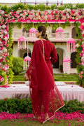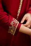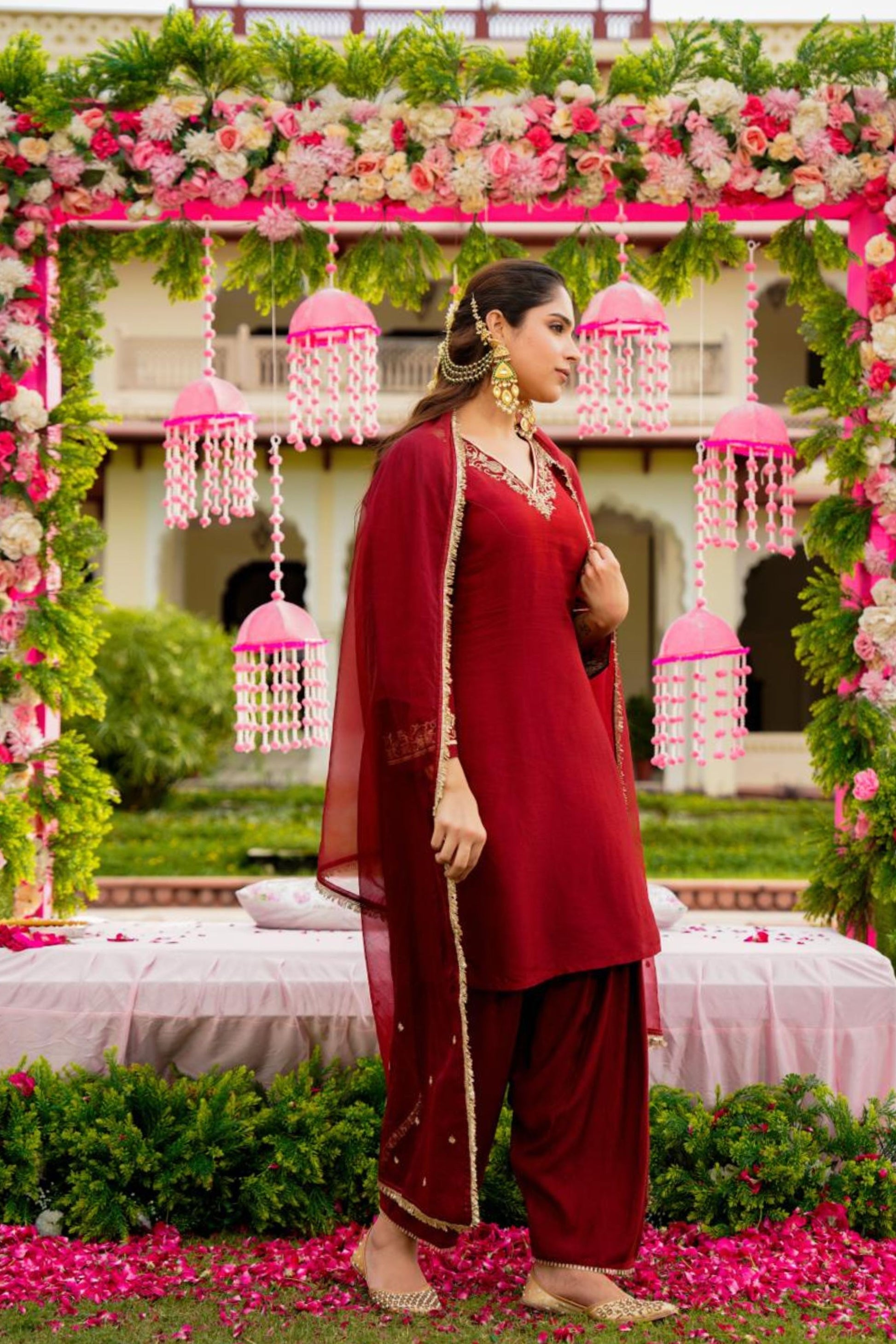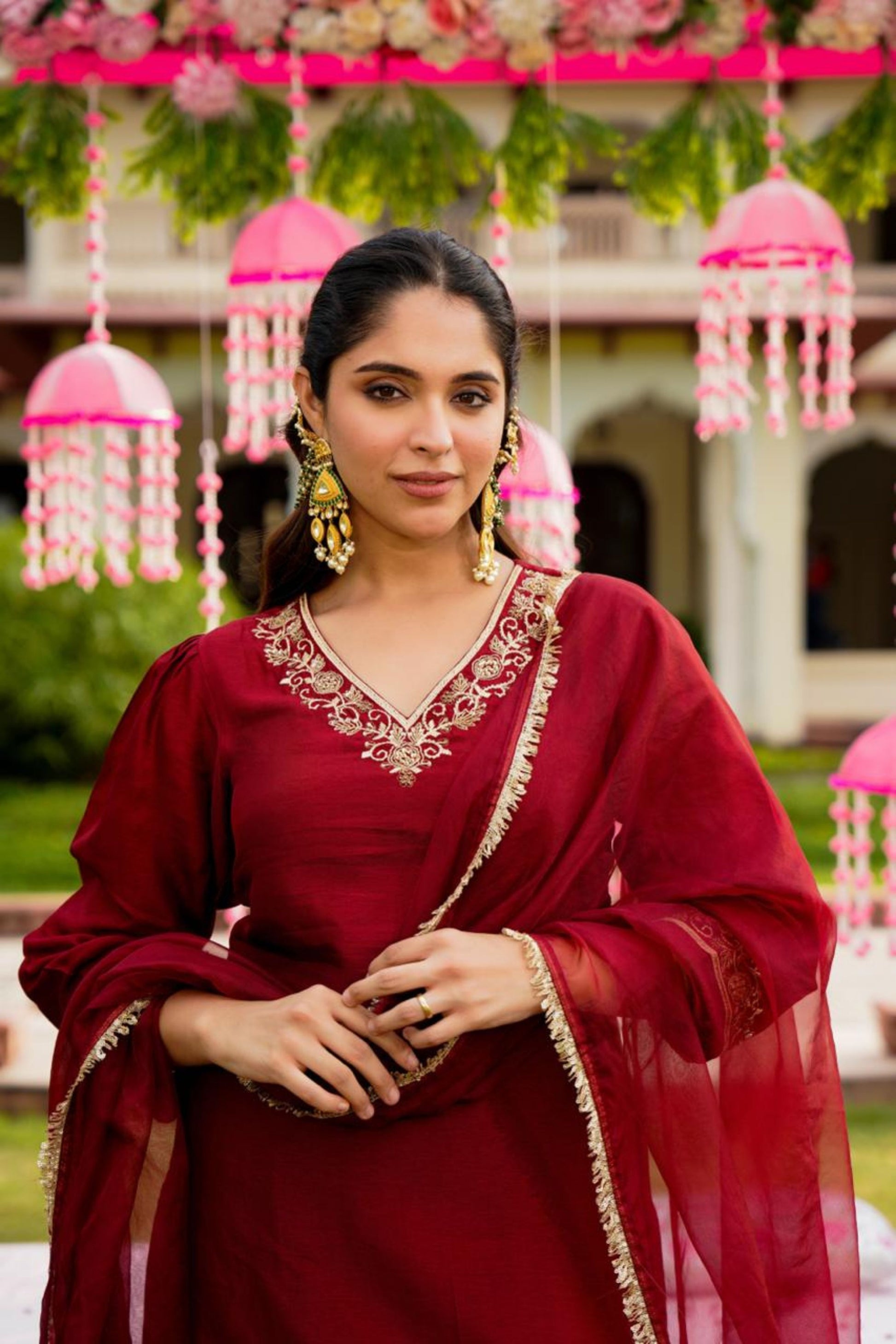 This maroon festive 3-piece suit set features an elegantly tailored kurta paired with matching pants and a coordinated dupatta. The rich maroon hue enhanced with delicate embroidery on the neckline creates a regal and festive ethnic look, perfect for celebrations, weddings, and special occasions. Crafted from luxurious silk fabric, this set offers a soft sheen with a smooth and comfortable feel. Graceful, festive, and timeless, it is an ideal choice for elegant festive dressing.