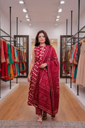 Drape yourself in the elegance of handcrafted art with this Maroon Ikat Print 3-piece suit set. The sleeveless kurta features a bold wave print inspired by nature, paired with striped bottoms and a rich Maroon shade dupatta adorned in traditional Ikat block prints. It’s breathable, lightweight, and steeped in heritage — perfect for conscious styling and everyday elegance.