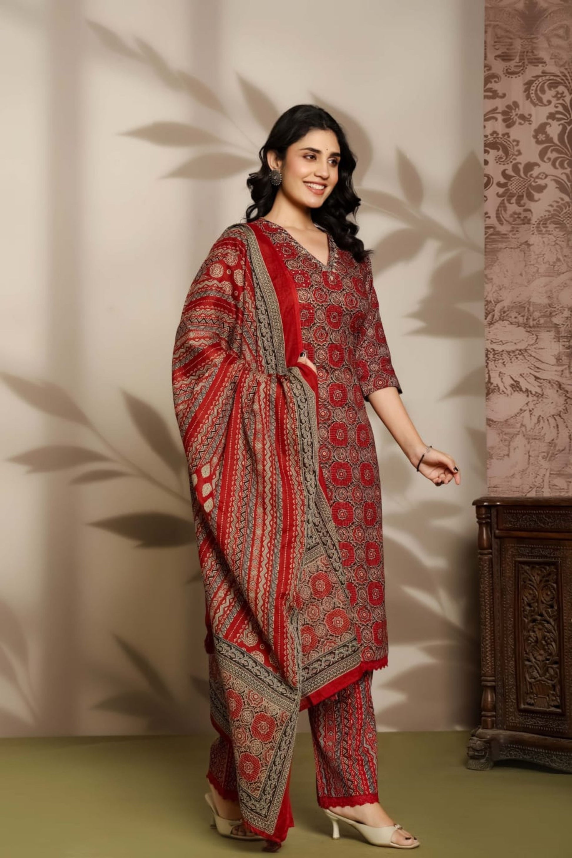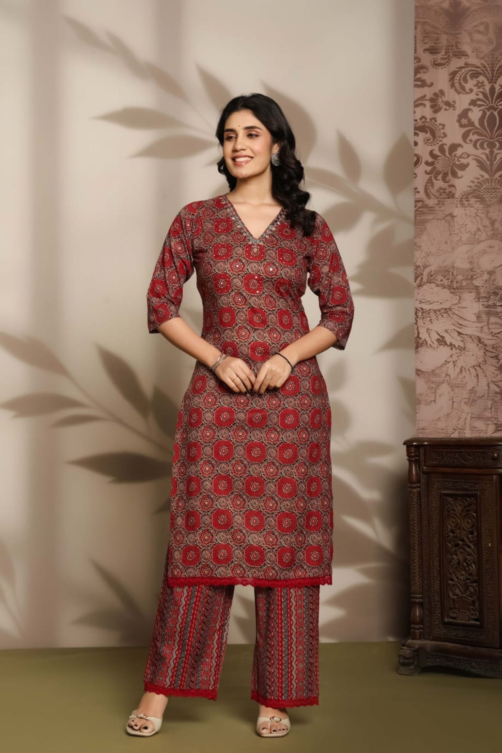 This maroon printed 3-piece suit set features a beautifully tailored kurta paired with matching pants and a coordinated dupatta. The elegant maroon base enhanced with intricate traditional prints creates a sophisticated and timeless ethnic look, perfect for everyday wear, casual outings, and small gatherings. Crafted from soft and breathable cotton fabric, this set offers all-day comfort with a relaxed and flattering fit. The printed dupatta with detailed border patterns adds a stylish and traditional touch to the overall ensemble. Classic, comfortable, and effortlessly graceful, it is an ideal choice for elegant ethnic dressing.