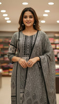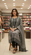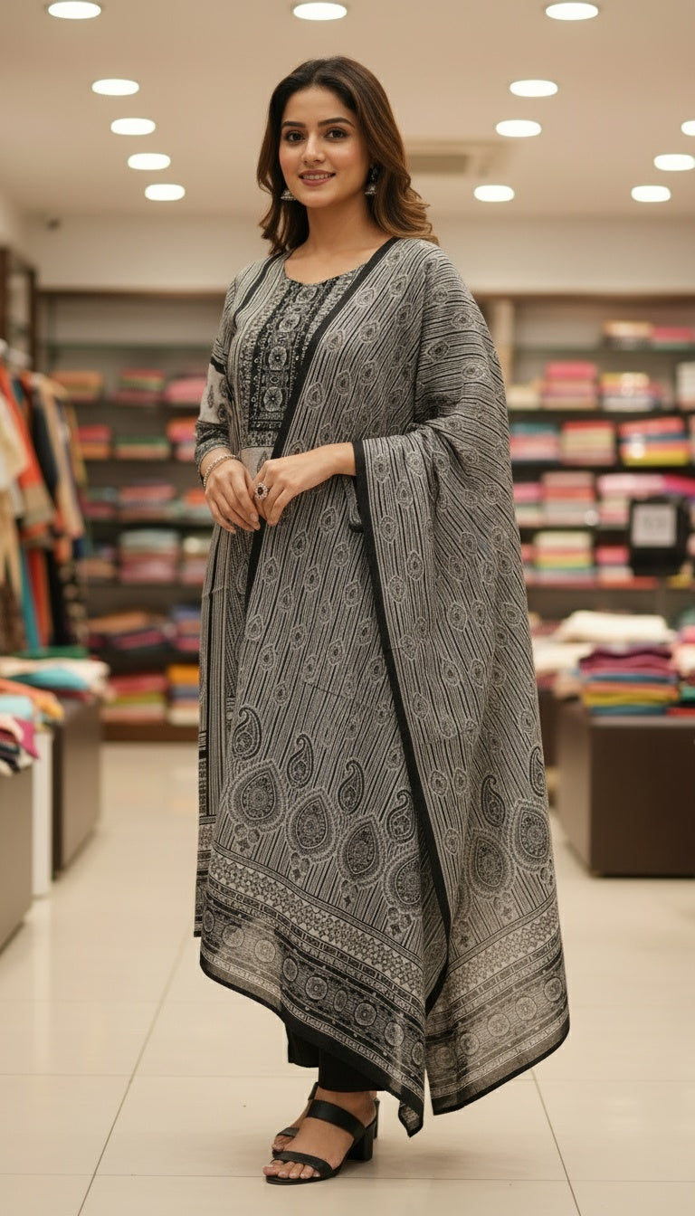 Make a statement in the Monochrome Black & Grey Printed Suit Set with Dupatta, designed for women who love effortless elegance. Crafted from soft, breathable fabric, this kurta features intricate black and grey prints that give a timeless appeal. Paired with matching pants and a flowy dupatta, it’s perfect for office wear, festive gatherings, or casual outings.