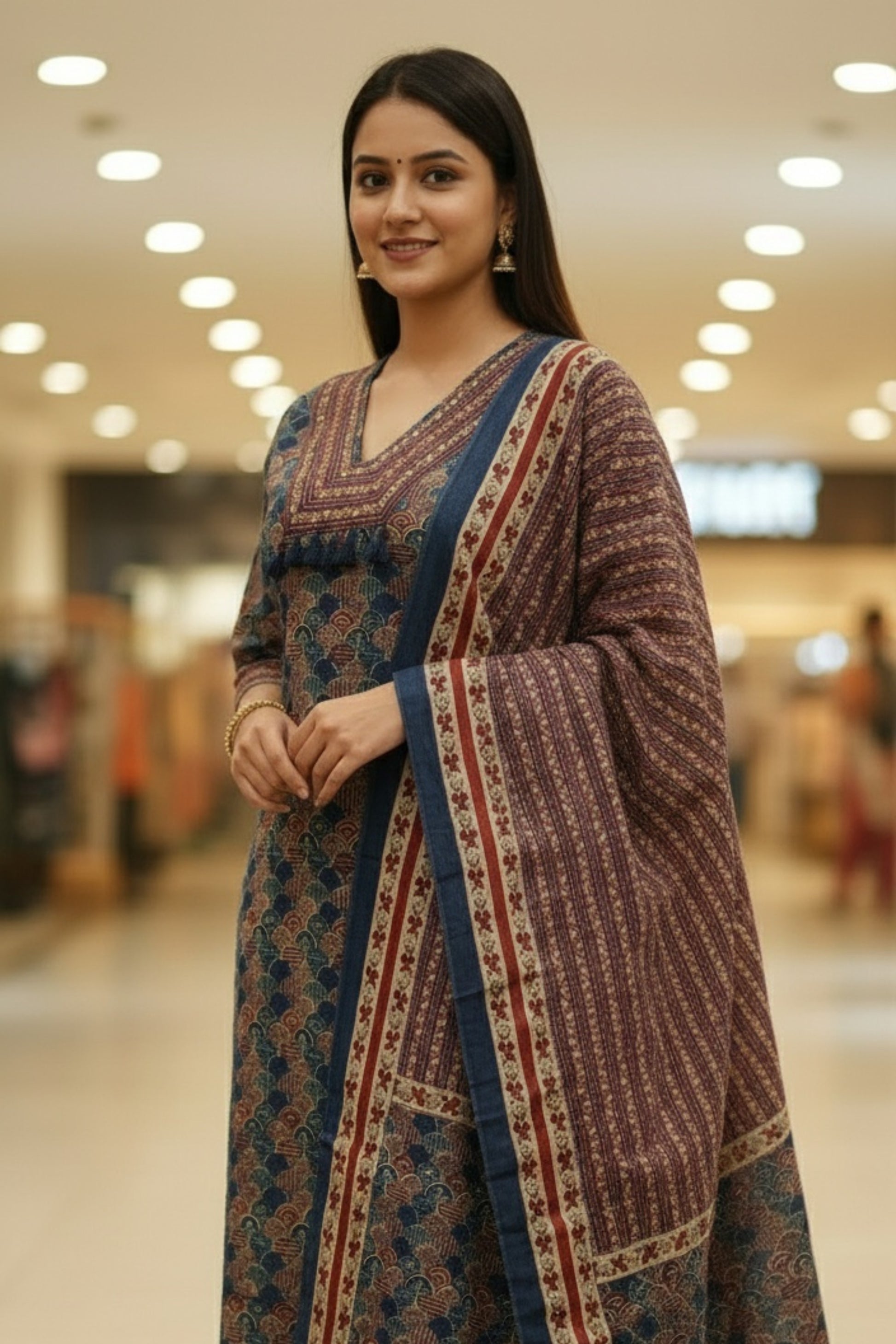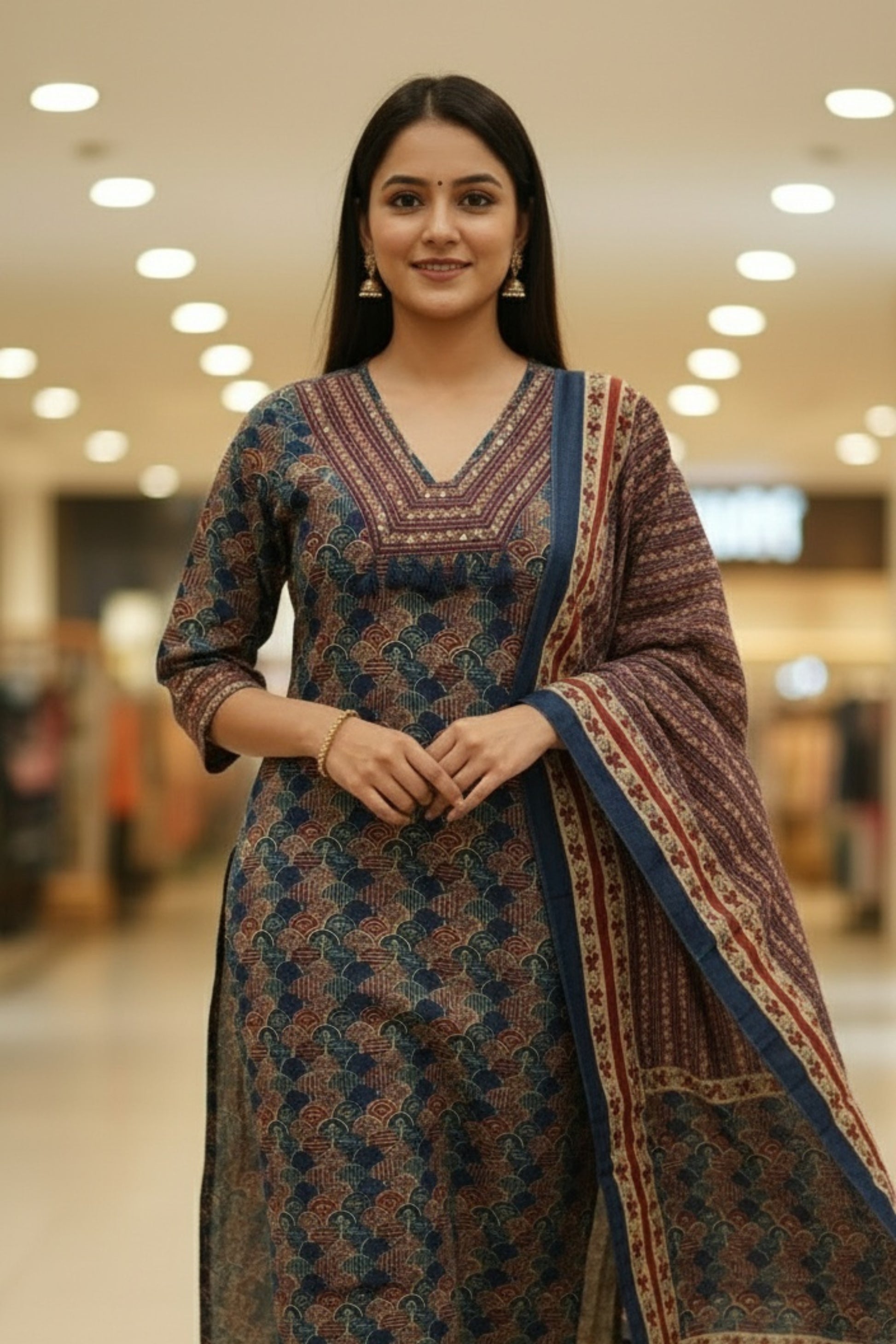 Infuse timeless charm into your ethnic collection with this Multi Color Ajrakh Print Cotton Suit Set. Crafted from breathable cotton, the kurta features intricate Ajrakh-inspired prints in earthy rust and deep navy tones, paired with matching printed pants and a beautifully coordinated dupatta. Perfect for festive occasions, office wear, or casual gatherings, this set blends traditional artistry with everyday comfort, making it a versatile addition to your wardrobe.
