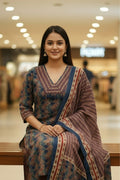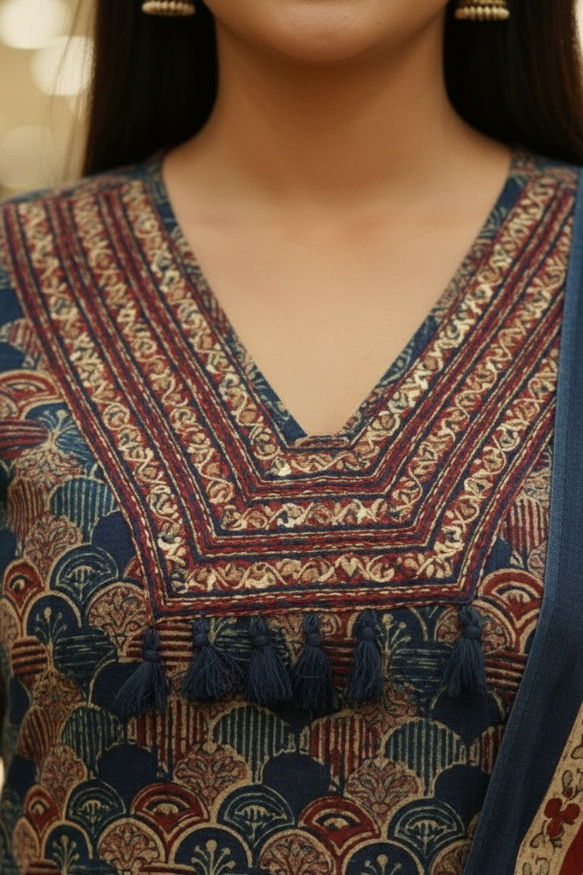 Multi Color Blue Ajrakh Print Cotton Kurta Pant Dupatta Set