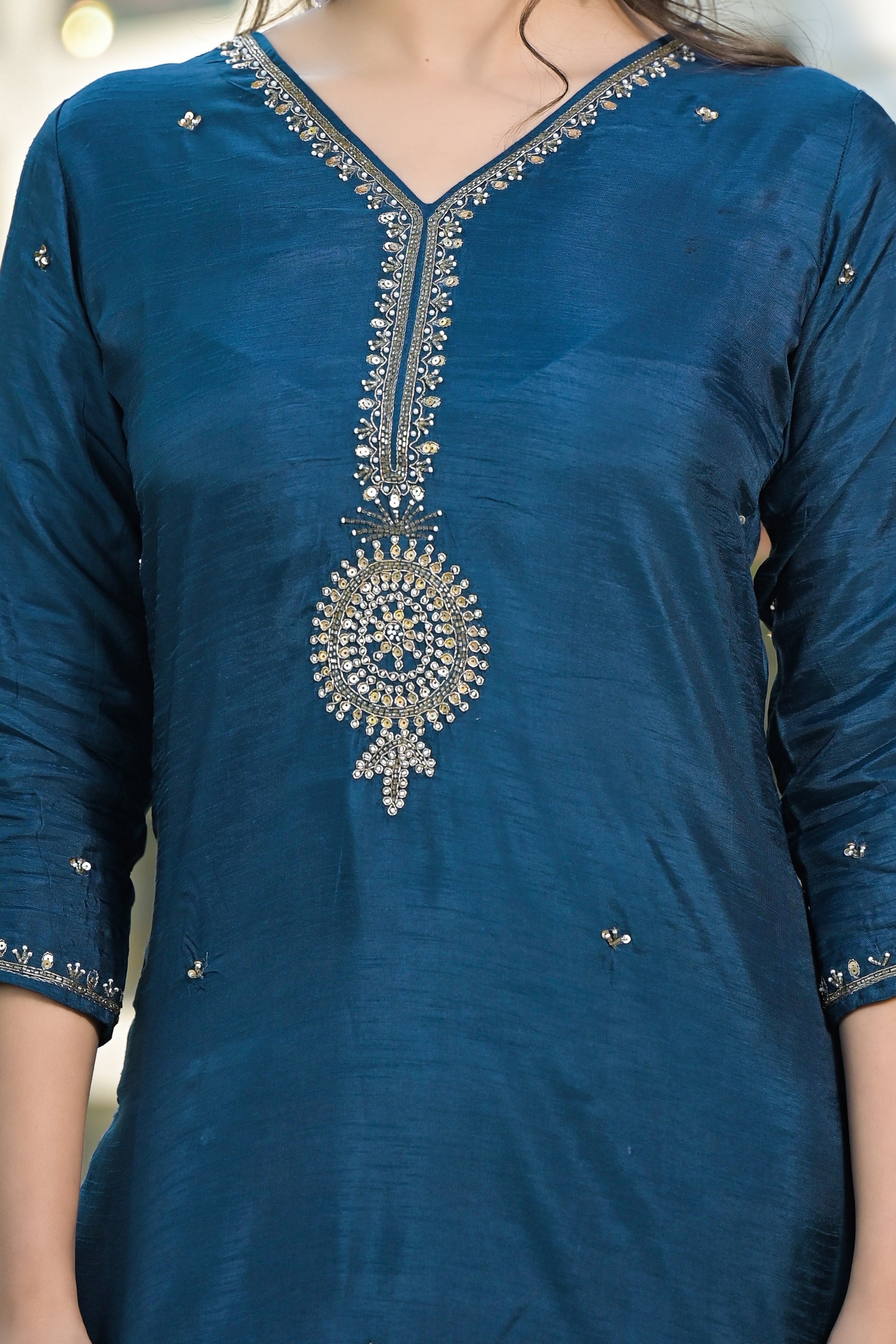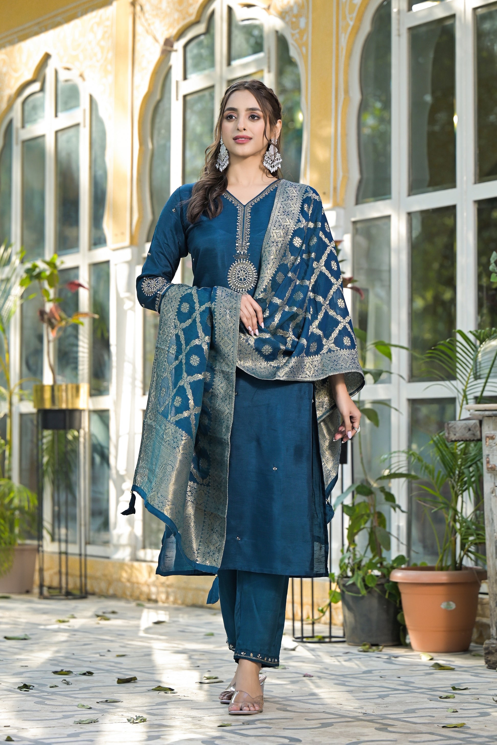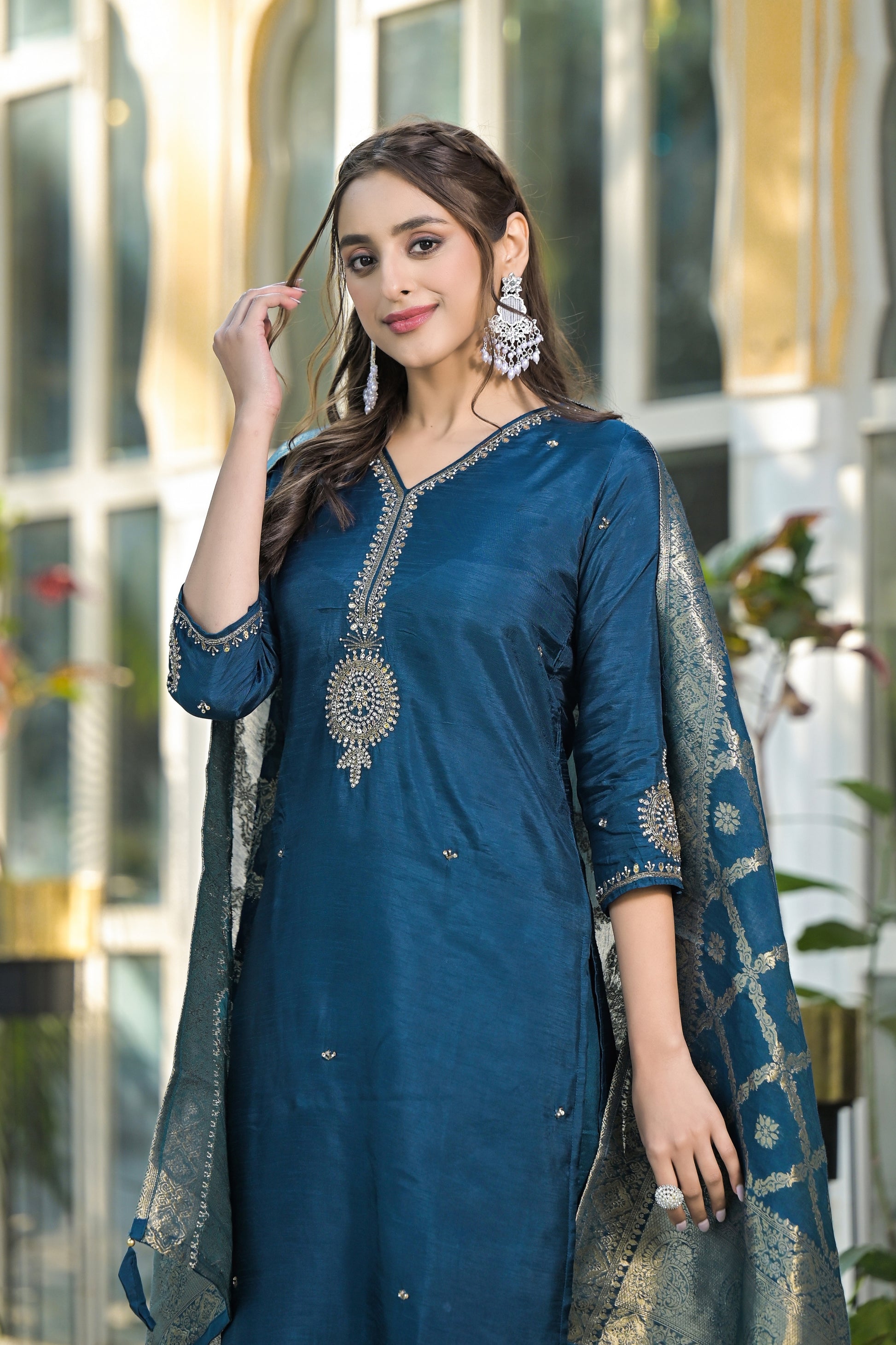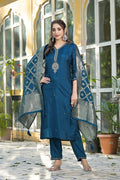 Radiate poise and sophistication in this Navy Blue Ethnic Suit Set, exquisitely detailed with golden zari embroidery that adds a royal touch to your festive style. Crafted from luxurious silk-blend fabric, the kurta features a handcrafted embroidered neckline and sleeve cuffs for timeless elegance. Paired with straight pants and a rich Banarasi dupatta, it perfectly blends traditional artistry with modern refinement.